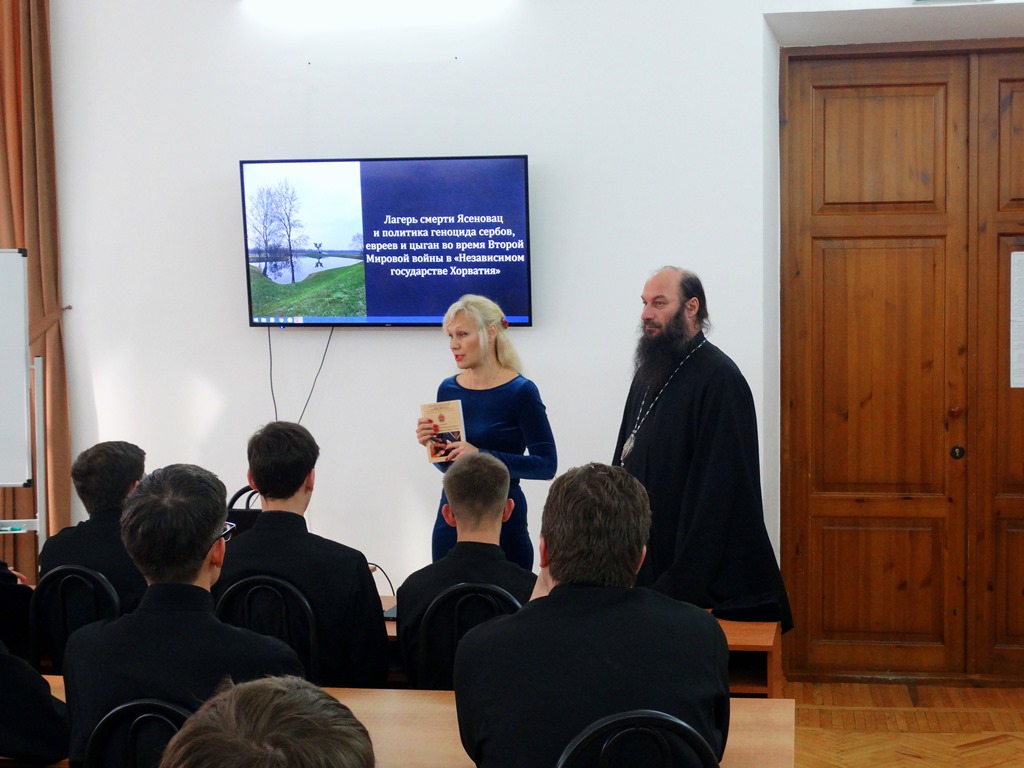Затем перед студентами с лекцией «Лагерь смерти Ясеновац и политика геноцида сербов, евреев и цыган во время Второй Мировой войны в «Независимом государстве Хорватия» выступили ведущий программы «Светлый вечер» на радиостанции «ВЕРА» Алексей Пичугин (Москва) и клирик Орской епархии священник Максим Бражников.