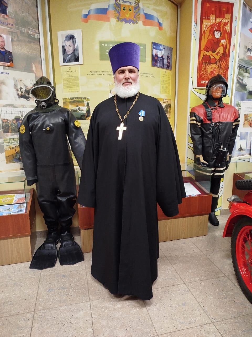 ОРЕНБУРГ. 30 апреля 2025 г. В день празднования 376-летия со Дня образования пожарной охраны России руководитель по церковной благотворительности и социальному служению протоиерей Вячеслав Кочкин был награждён медалью Министерства Российской Федерации по делам гражданской обороны, чрезвычайным ситуациям и ликвидации последствий стихийных бедствий.
