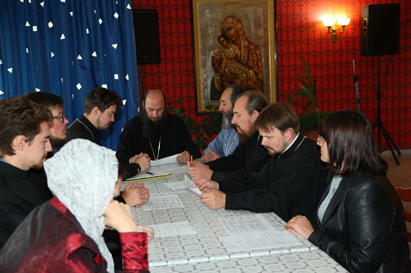 В начале мероприятия состоялось собрание преподавателей курсов, которое возглавил владыка Ириней. На собрании присутствовали: директор курсов протоиерей Александр Куцов и преподаватели – священники Александр Трушин, Максим Бражников, Григорий Сычев, Георгий Чернявский, а также Елена Вячеславовна Гоппе, Наталья Владимировна Фатеева.