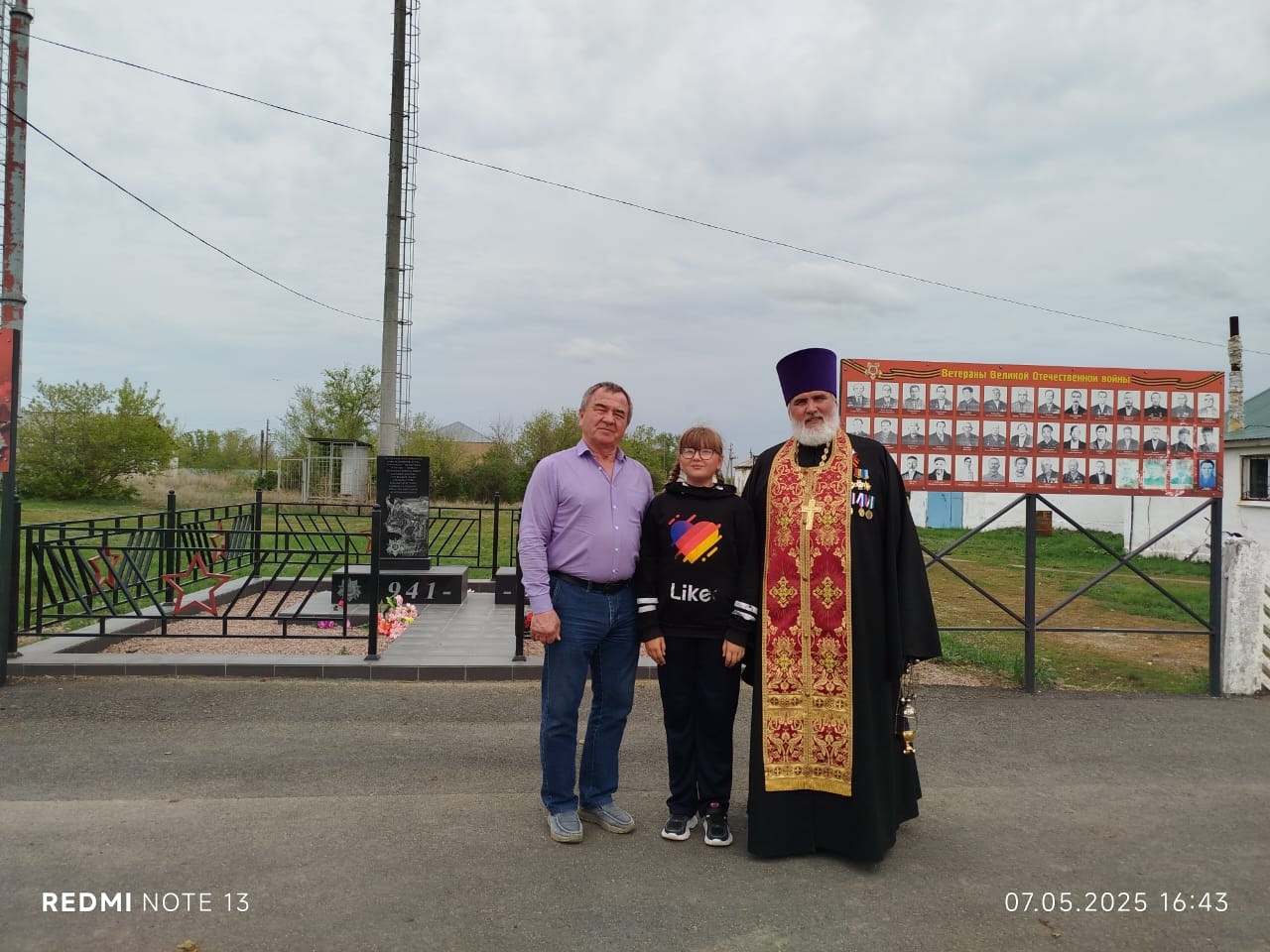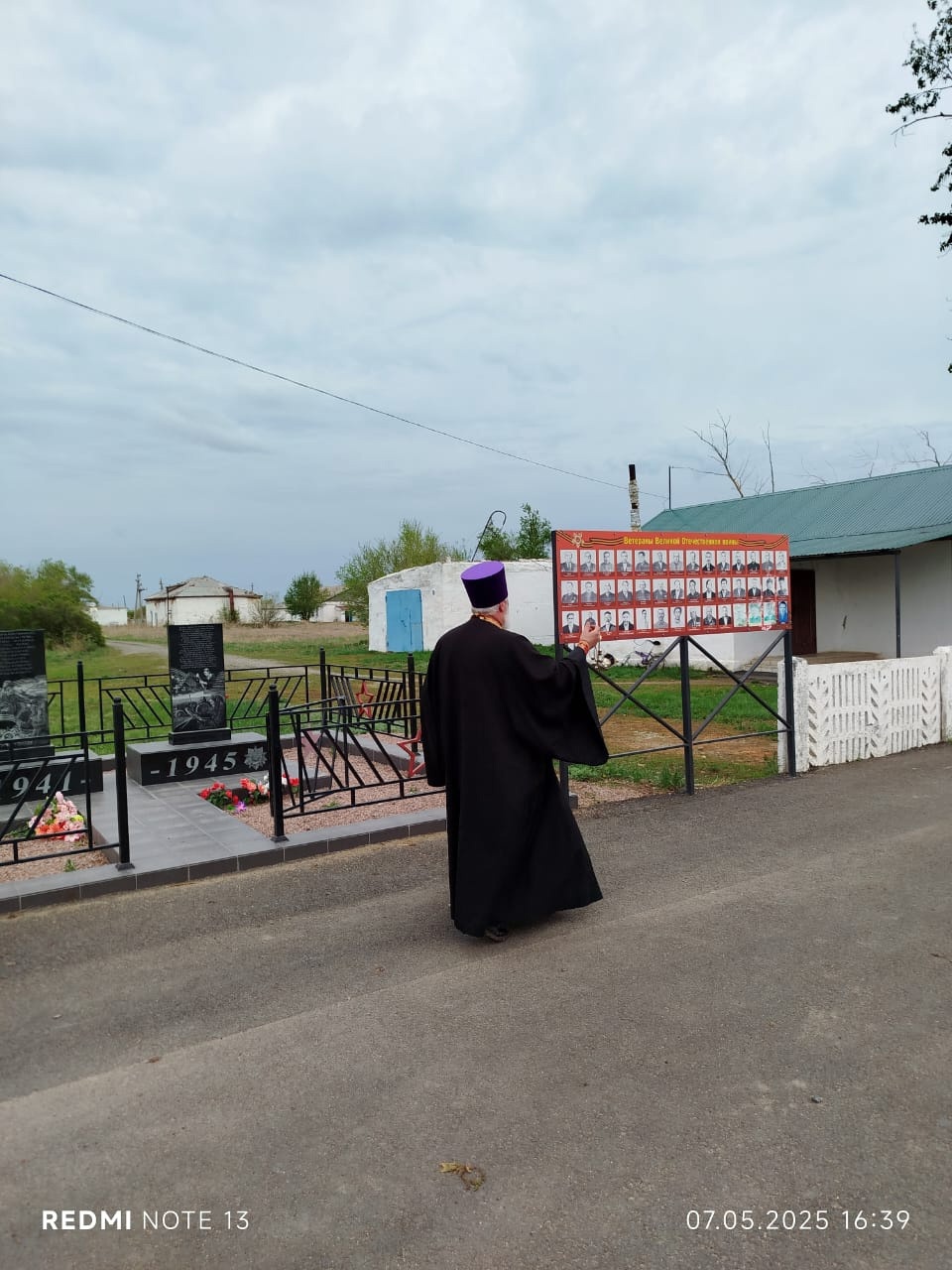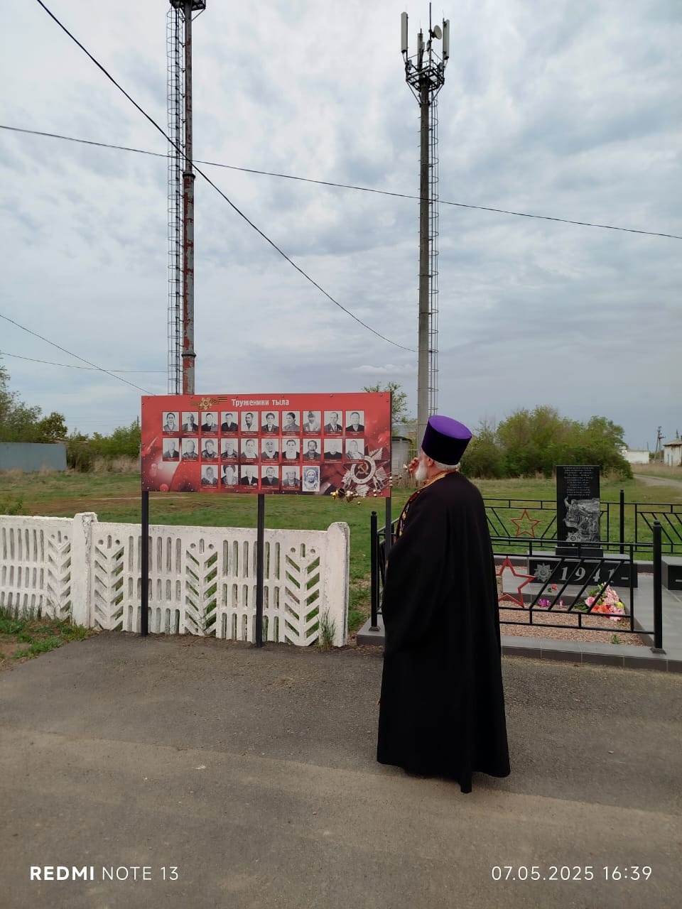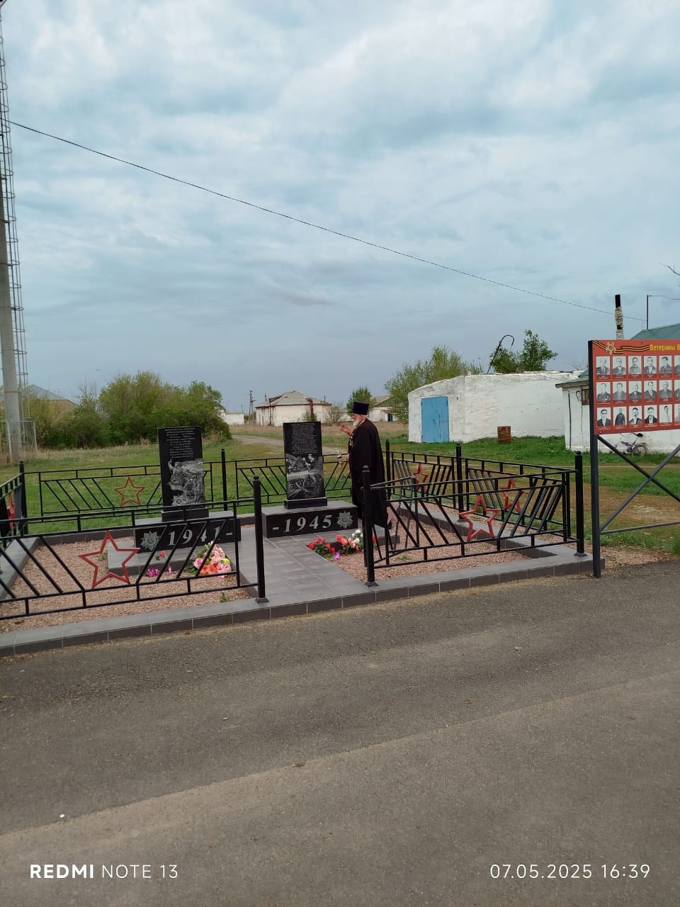 П. СОВХОЗНЫЙ АДАМОВСКОГО Р-НА. 7 мая 2025 г. В преддверии 80-летия Победы в Великой Отечественной войне 1941-1945 гг. благочинный Адамовского района протоиерей Вячеслав Кочкин совершил панихиду около памятного мемориала, посвященного участникам ВОВ и труженикам тыла.