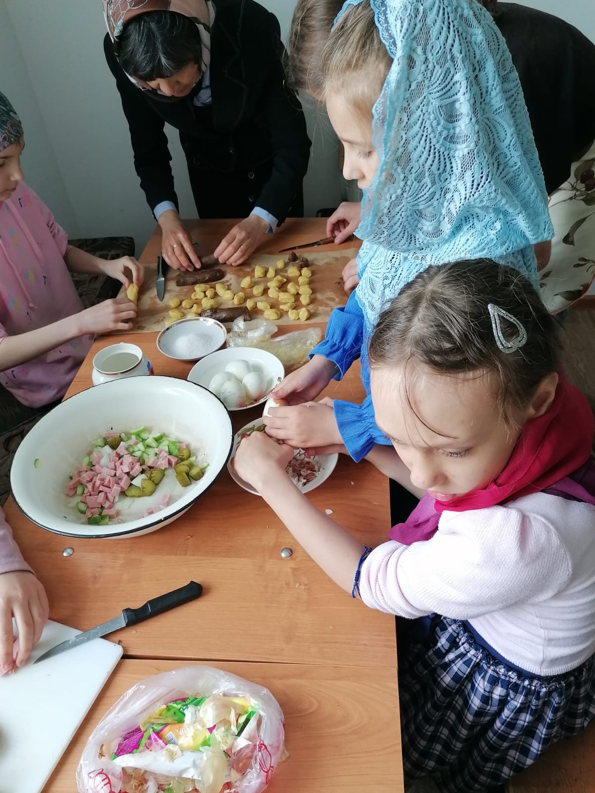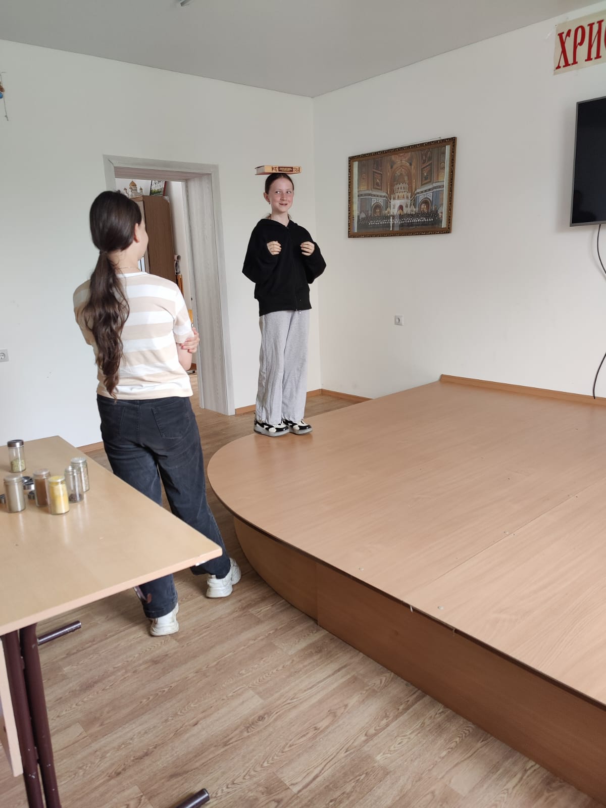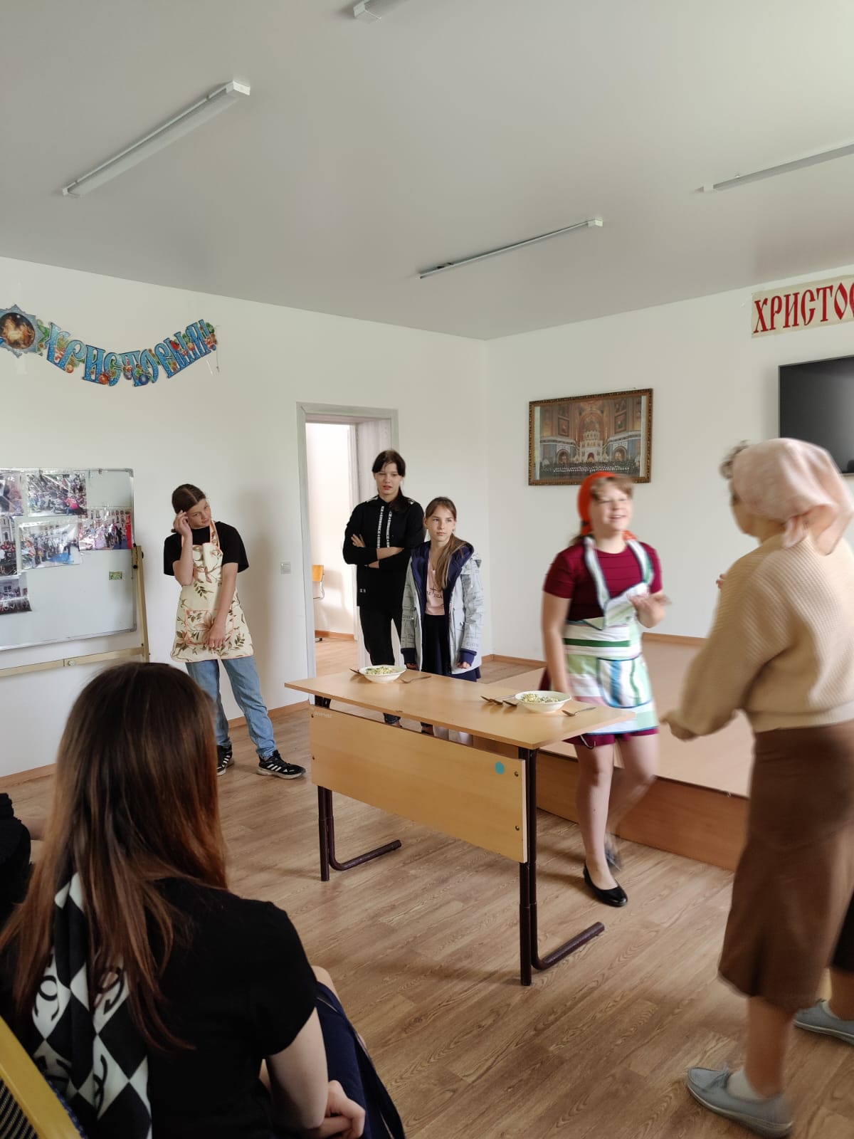 Две команды девочек «Дружные ребята» и «Непоседы» соревновались в знании истории праздника Жен –мироносиц, в кулинарных тонкостях, с завязанными глазами определяли по запаху специи, проверяли свою грацию на подиуме с книгой на голове, пели песни и читали стихи.
