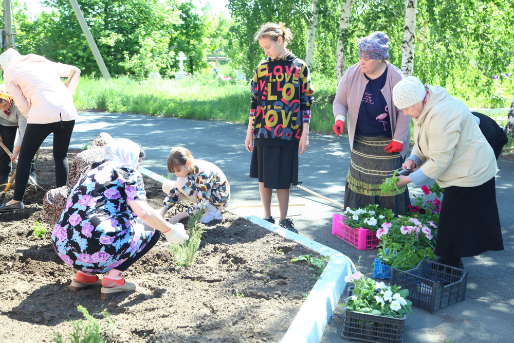 Уже много лет подряд, в марте месяце, настоятель храма протоиерей Анатолий Сопига служит молебен на начало благого дела, и ученики воскресной школы высевают семена цветов, затем они ухаживают за подросшей рассадой, а родители подготавливают черенки гераней. Дополнительно о. Анатолий с матушкой Неониллой закупили и рассаду петуний. Пришла пора высаживать цветы на клумбы. Как всегда, организатором и вдохновителем работ была матушка Неонилла.