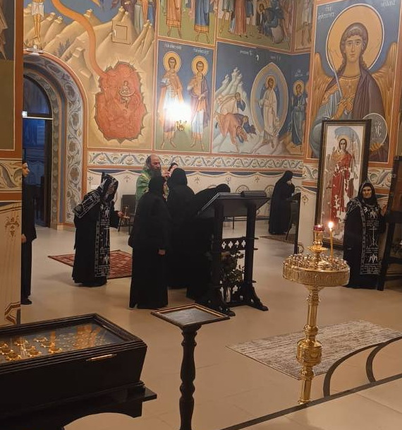 Епископ Ириней молился на полунощнице и утрене, за которой совершил елеопомазание сестер, а затем возглавил Божественную литургию архиерейским чином в сослужении архидиакона Викентия