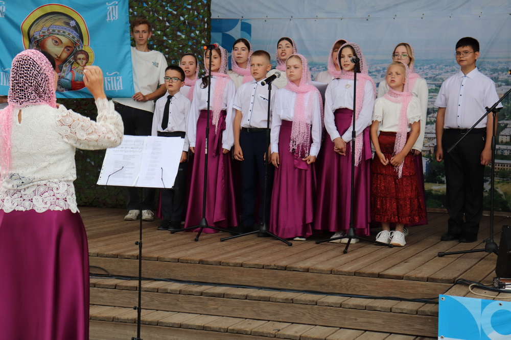 После приветственного слова клирика Петропавловского храма священника Даниила Желтухина, перед собравшимися жителями города выступил хор воспитанников воскресной школы под управлением Юлии Канаевой. Ребята исполнили гимн воскресной школы «Александр Великий Князь» и «Русь называют Святою».