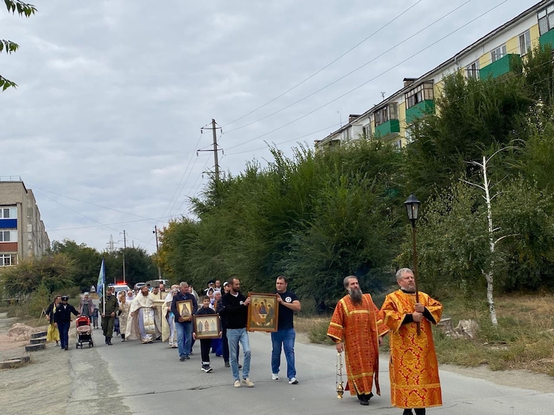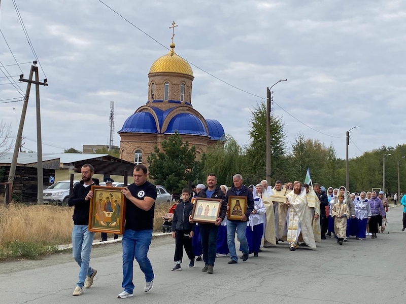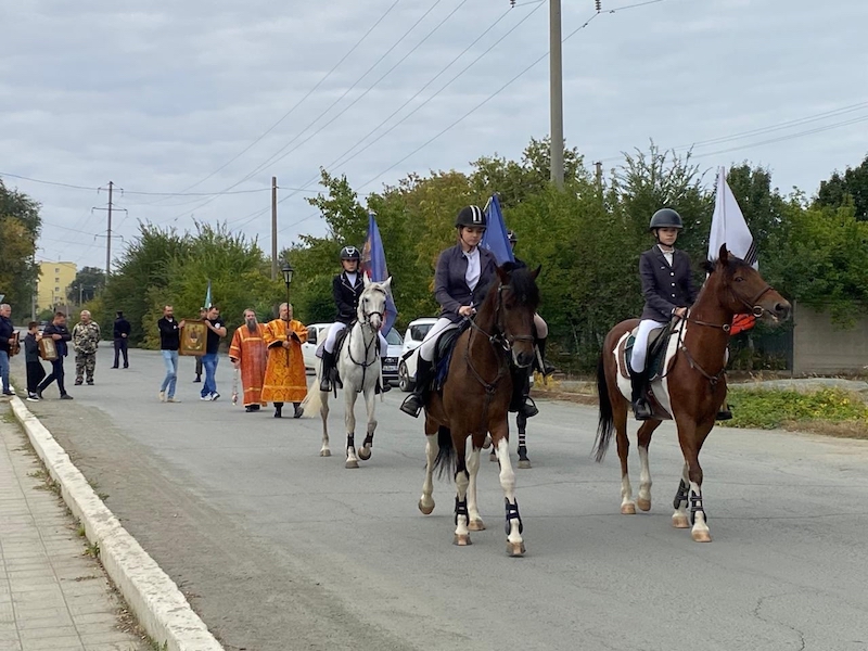 После отпуста Литургии состоялся крестный ход по поселку Степной, в котором приняли участие представители конно-спортивной школы "Свобода", организации "Русская Община" и казачьих дружин.