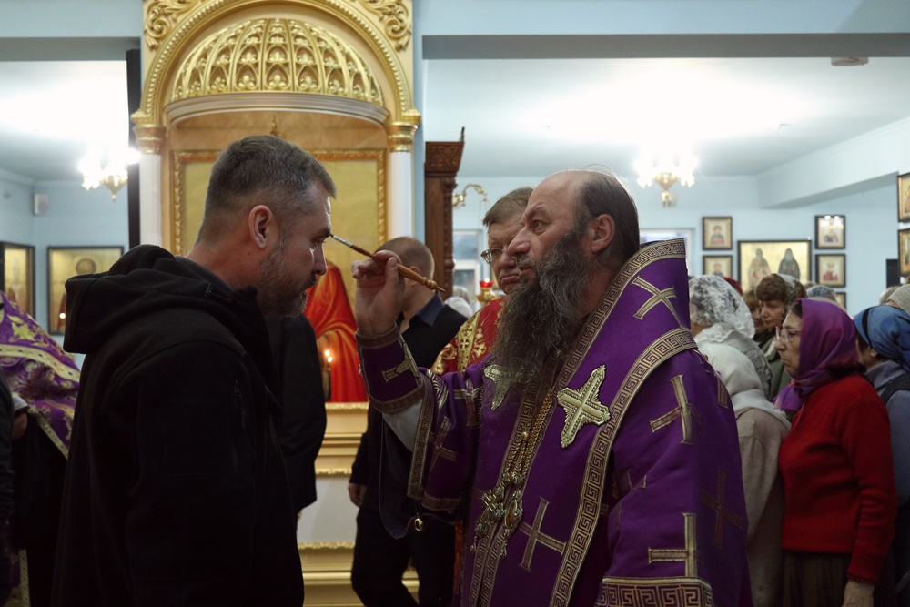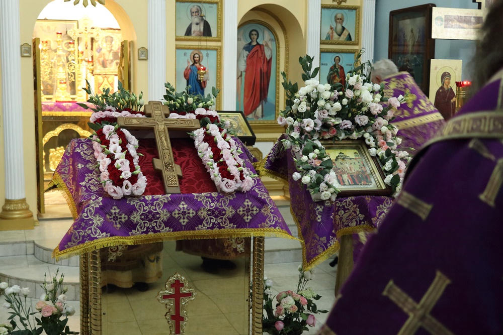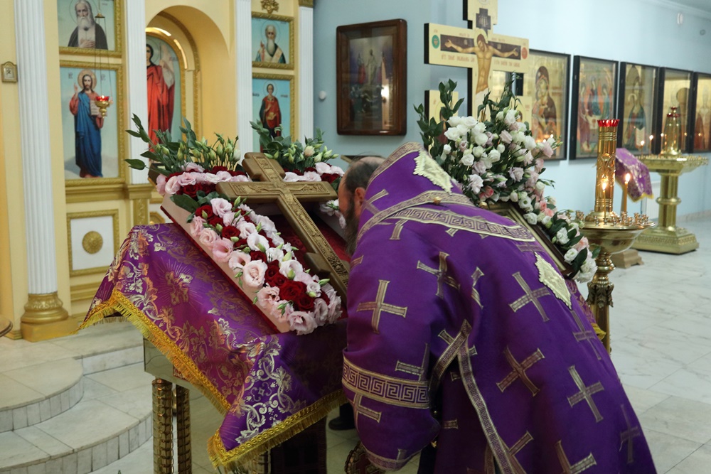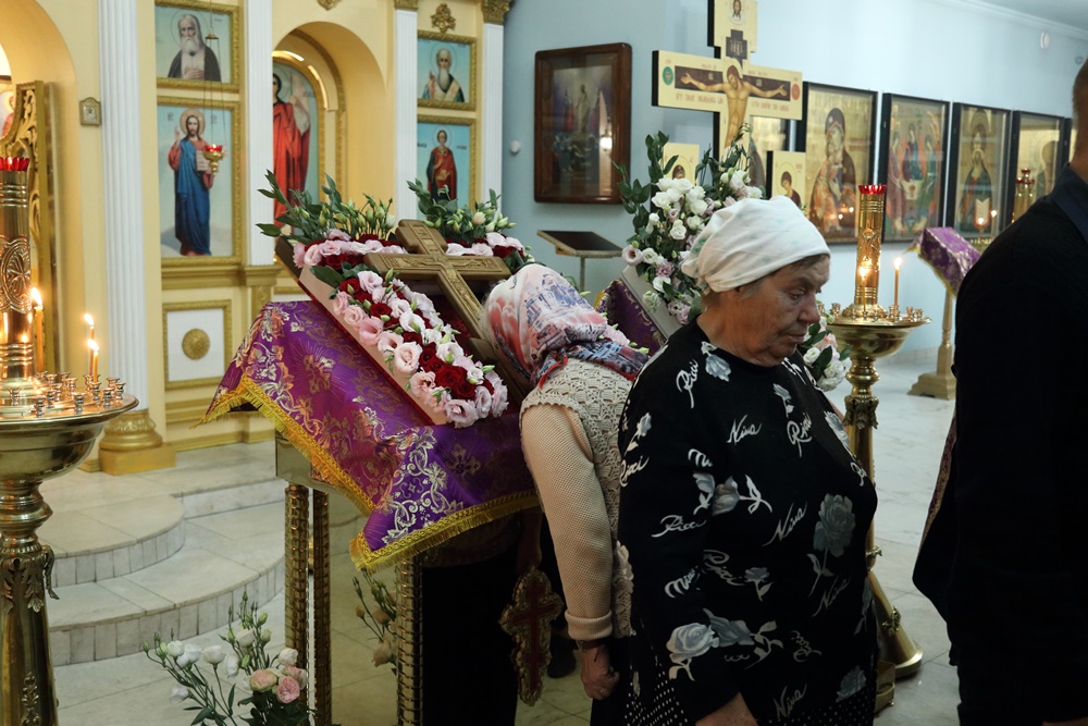 После великого славословия правящий архиерей совершил вынос Креста и чин Воздвижения. На четыре стороны света - восток, запад, север и юг - епископ Ириней осенил Крестом верующих, при этом хор пел стократное «Господи, помилуй», а священнослужители возливали на Крест освященную благовонную воду. После четвертого воздвижения епископ снова осенил Крестом на восток и возложил его на аналой для поклонения. Верующие приложились к Кресту и подошли к правящему архиерею для елеопомазания под пение особых стихир.