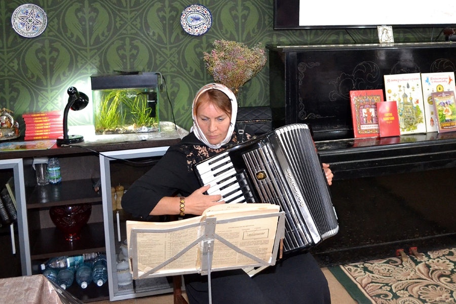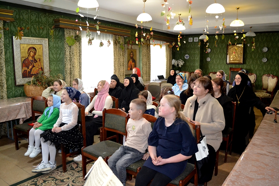 После общей молитвы началось увлекательное путешествие в мир книг. Монахиня Вера, наставница девочек, посещающих воскресную школу, сообщила, что книга – это чудо из чудес и продолжила: «С самого раннего детства мы рассматриваем картинки в книжках, потом учимся читать. Книги бывают разные: веселые и грустные, познавательные, сказочные. Мы открываем книгу, перелистываем страницы, и происходит удивительное чудо: книга начинает с нами говорить, уносит нас то в тридевятое царство, то в тридесятое государство. Книга заставляет плакать и переживать, смеяться и страдать, жить вместе с ее героями. Книга – удивительная вещь! Монастырская библиотека, конечно, отличается от обычной библиотеки, потому что здесь преобладает наличие духовной литературы».