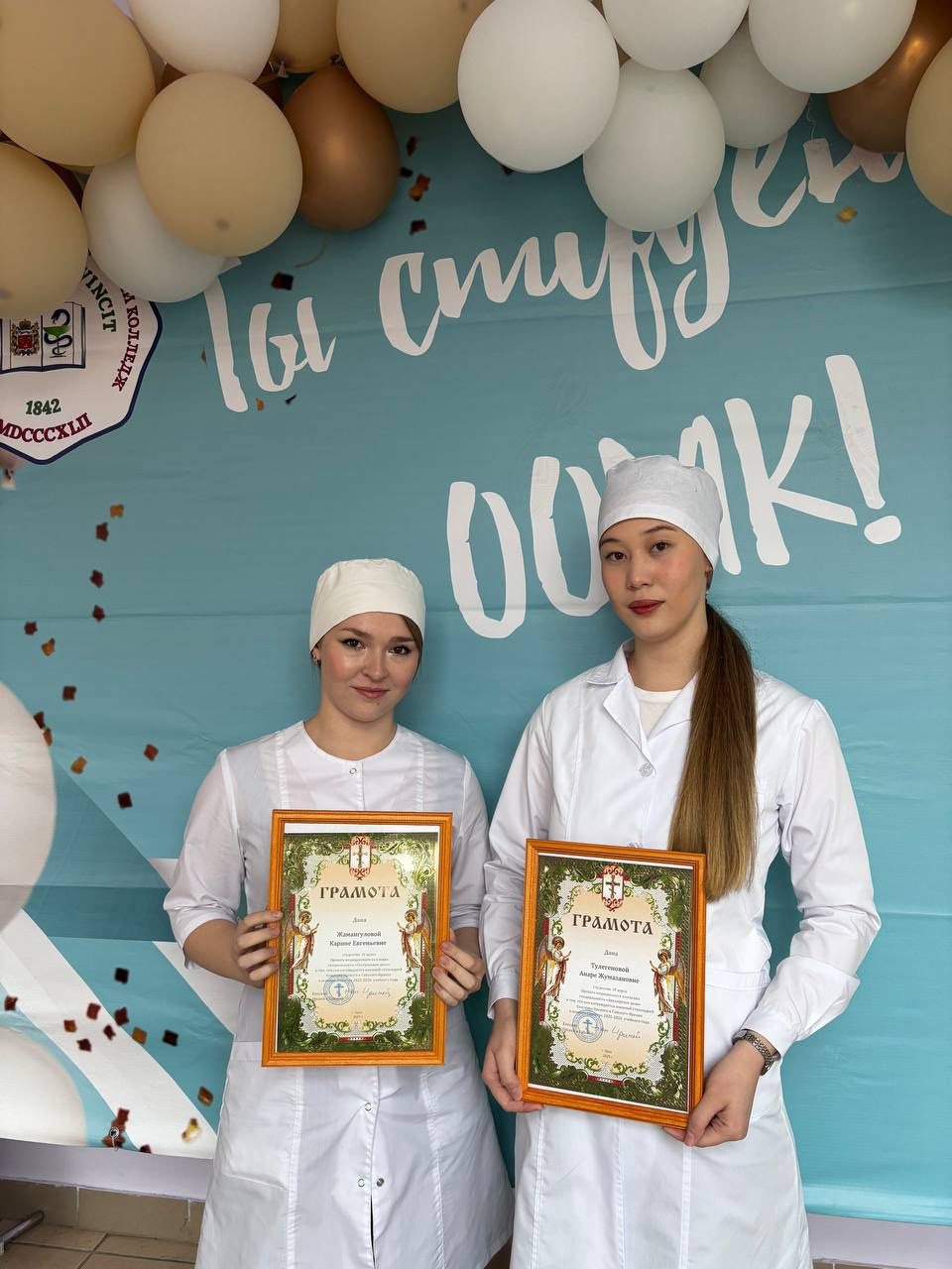 Затем для награждения архиерейскими грамотами епископ Ириней на середину конференц-зала пригласил Карину Жамангулову (специальность «Сестринское дело») и Анару Тулегенову (специальность «Акушерское дело»).