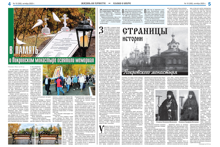 Центральный материал номера – статья Виктора и Татьяны Базилевских «В память о Покровском монастыре освятили мемориал» о том, как на территории бывшего Покровского женского монастыря г. Орска открыли мемориал в память о бывшей здесь обители, закрытой 100 лет назад. Мероприятие было приурочено к 30-летию возобновления богослужебной жизни и восстановления Покровского храма. Тему продолжает материал старшего научного сотрудника НИИ истории и этнографии Южного Урала ОГУ Дениса Денисова «Cтраницы истории Покровского монастыря».