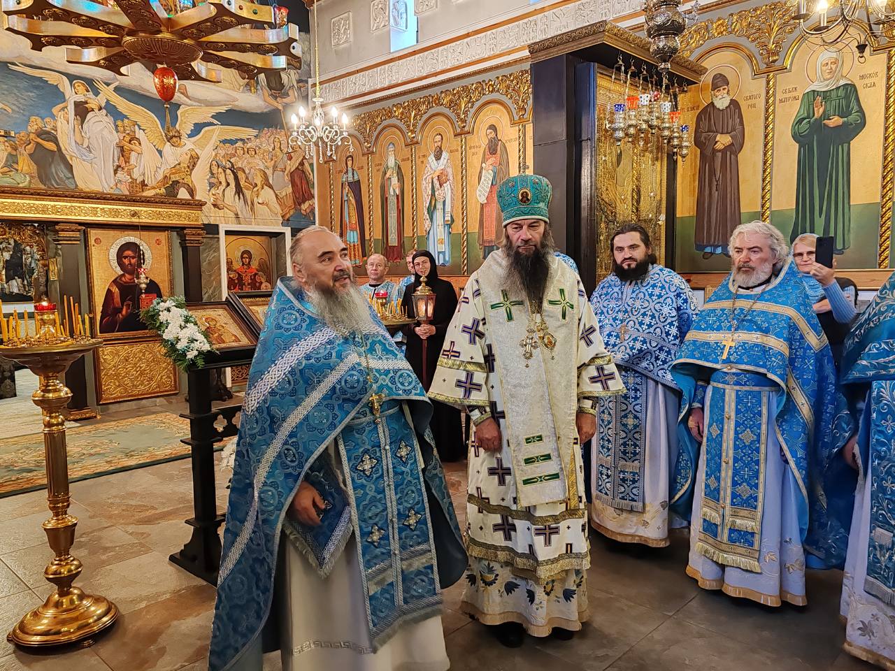 Его Преосвященству сослужили: насельник Николо-Угрешского монастыря иеромонах Макарий, настоятель Свято-Георгиевского кафедрального собора протоиерей Александр Куцов, благочинный Кувандыкского округа протоиерей Симеон Антипов, клирик Иверского монастыря протоиерей Георгий Дынник, клирик Николо-Угрешского ставропигиального мужского монастыря иеромонах Макарий (Умаров), настоятель Покровского храма п. Светлого священник Михаил Рябинов, клирик Казанского храма священник Вячеслав Коротков, настоятель Свято-Архангельского храма священник Геннадий Новиков, архидиакон Викентий (Геницэ).