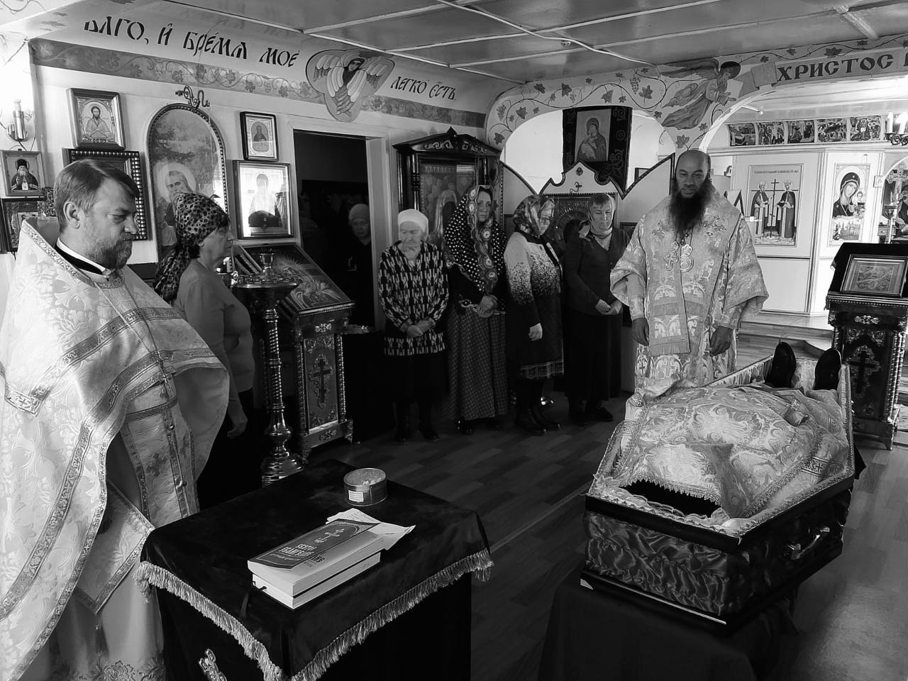 Прощание с отцом Алексием началось с Божественной литургии, за которой Преосвященнейшему архипастырю сослужили настоятель Покровского храма священник Михаил Рябинов, настоятель храма иконы Божией Матери «Избавительница» г. Орска священник Игорь Гогалюк и клирик Преображенского храма пос. Домбаровского священник Александр Никитин. После Литургии епископ Ириней возглавил отпевание.