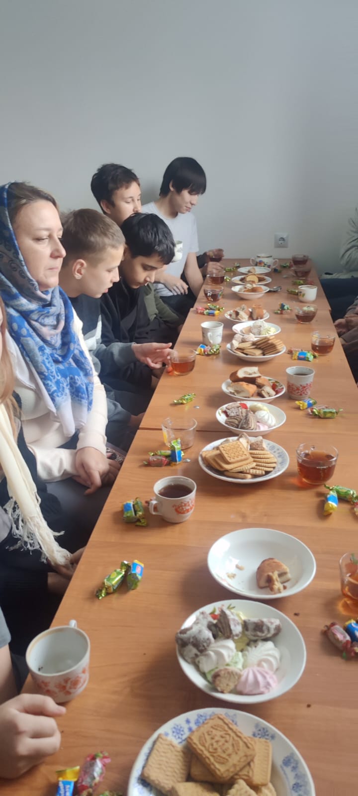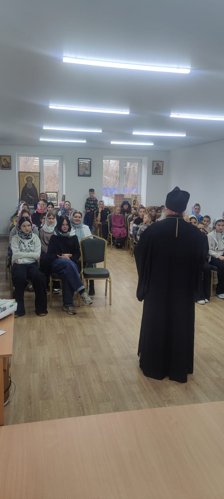 Более 40 воспитанников воскресной школы, среди которых и дети из ГБУСО «СРЦН» «Аленушка», а также пришедшие в школу вместе с социальным педагогом Ю. В. Джулановой четырнадцать подростков из гимназии, затаив дыхание слушали выступление настоятеля храма, протоиерея Симеона Антипова.