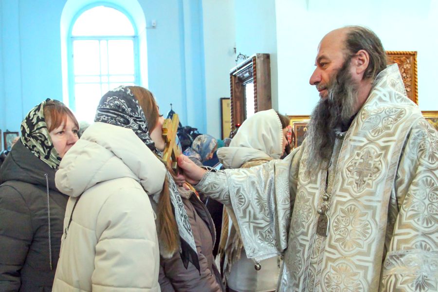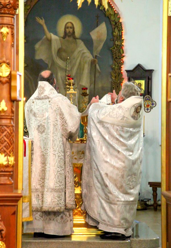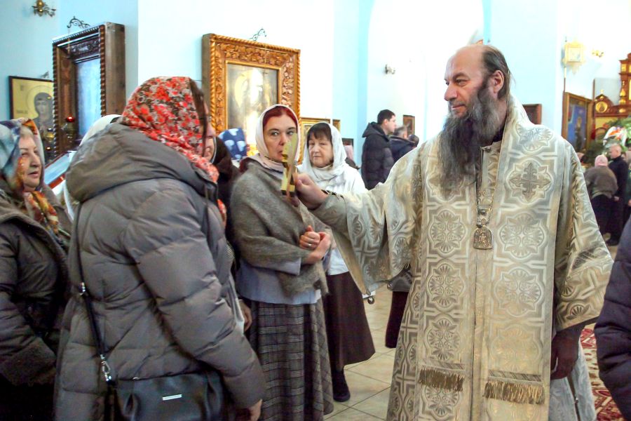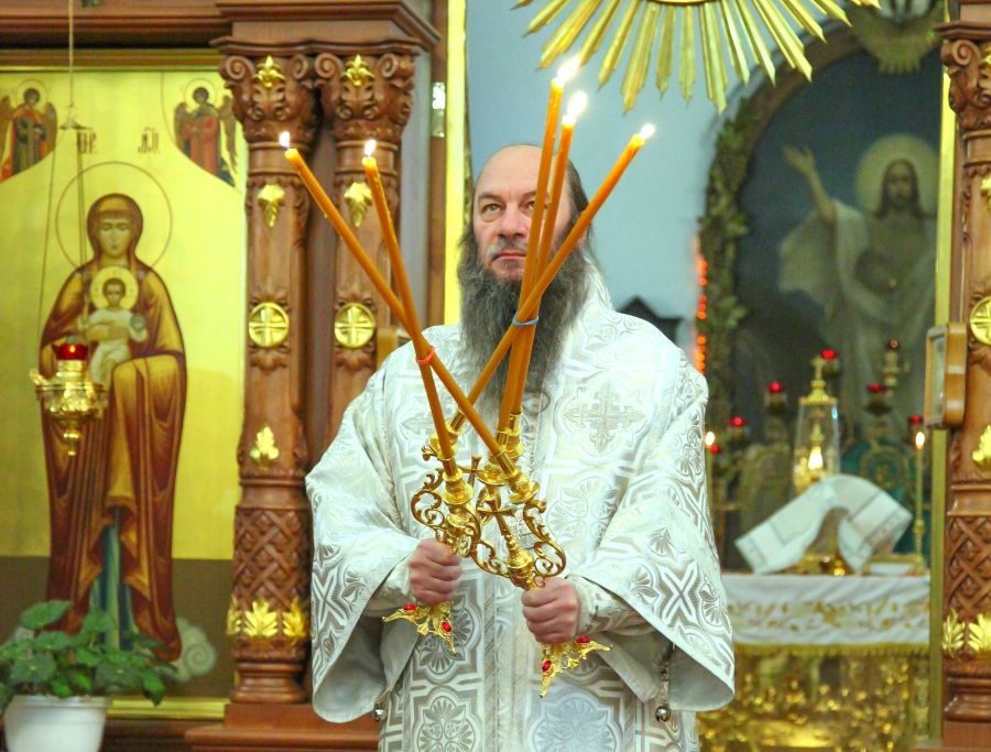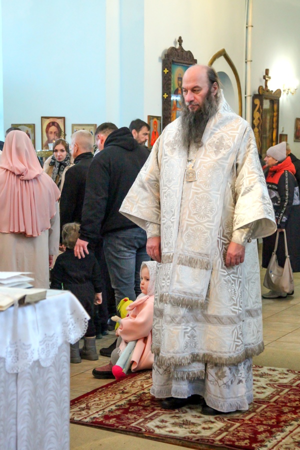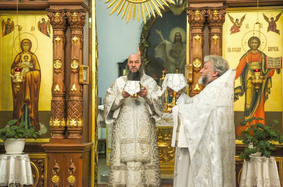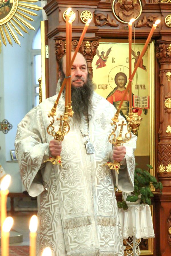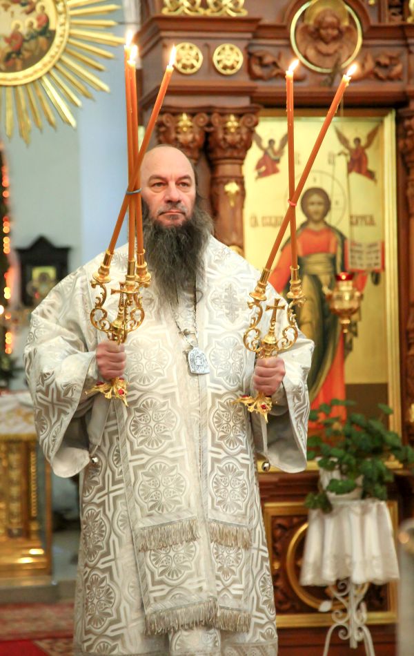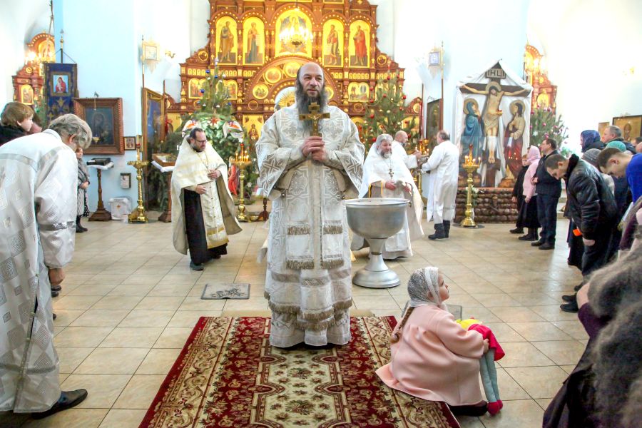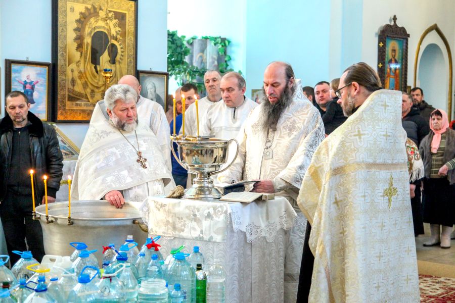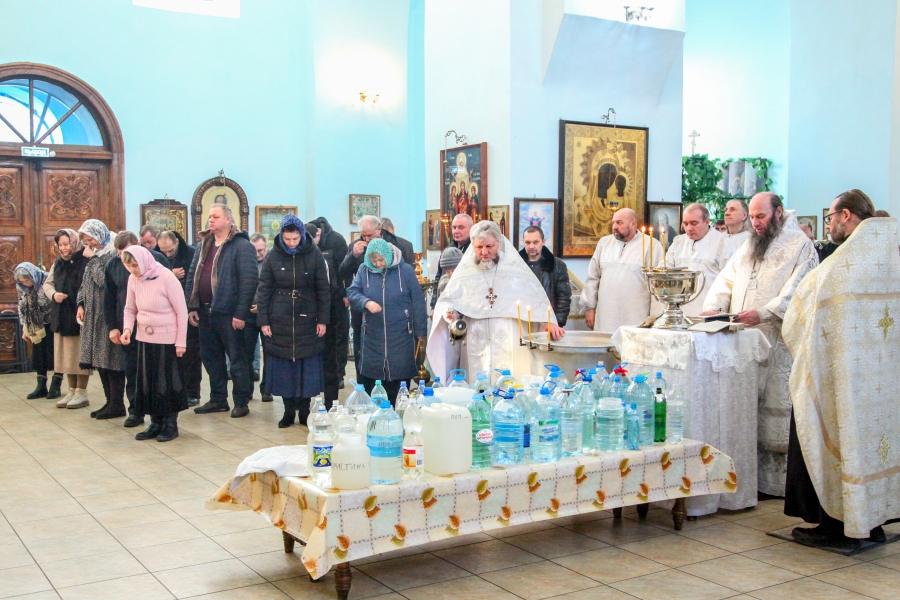 Его Преосвященству сослужил настоятель храма протоиерей Анатолий Сопига. Исповедь принимал священник Олег Соболевский. После отпуста Литургии был совершен 9 час и великая вечерня с чтением паремий праздника. При пении стихир «Глас Господень на водах…» правящий архиерей в сопровождении настоятеля храма протоиерея Анатолия Сопиги и священника Олега Соболевского вышел на середину храма, где совершил великое освящение воды.