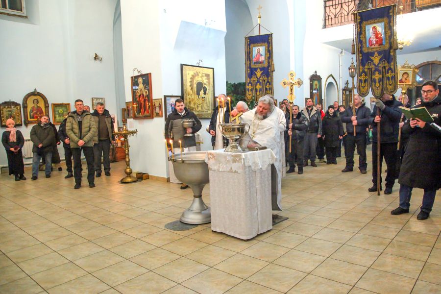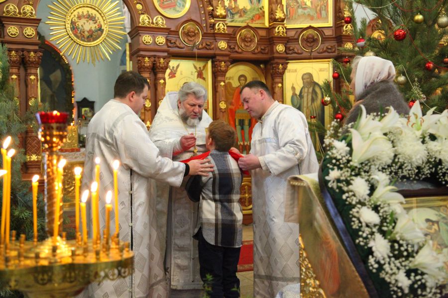 Божественную литургию совершил настоятель храма протоиерей Анатолий Сопига в сослужении диакона Иоанна Алексеева. По сугубой ектении с умилением сердец совершили молитву о Святой Руси. После отпуста Литургии священнослужители совершили чин великого освящения воды и возглавили крестный ход вокруг храма. Настоятель поздравил всех присутствующих с праздником, обратился к собравшимся с проповедью, а после пригласил прихожан приложиться ко Кресту, щедро окропляя всех крещенской водой.