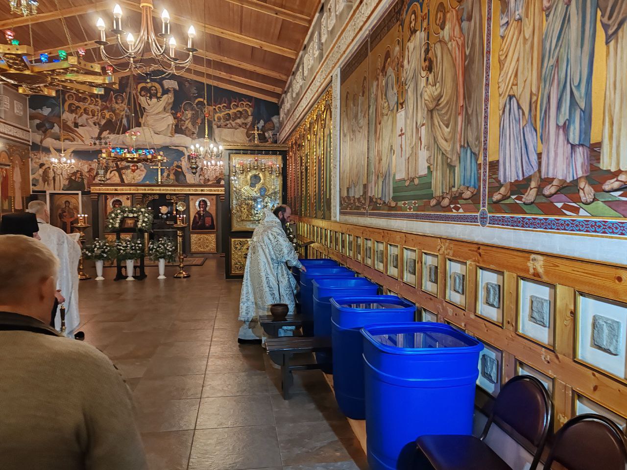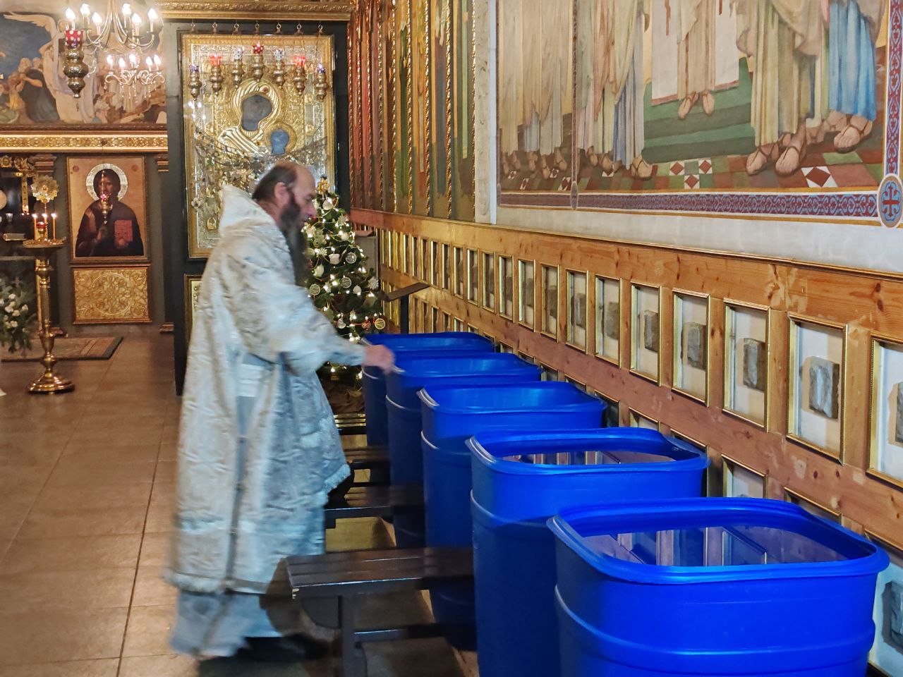 По заамвонной молитве правящий архиерей возглавил чин великого водоосвящения, а после окропил храм и прихожан великой агиасмой. После отпуста чина Преосвященнейший Ириней обратился к молящимся со словами поздравления и проповедью.