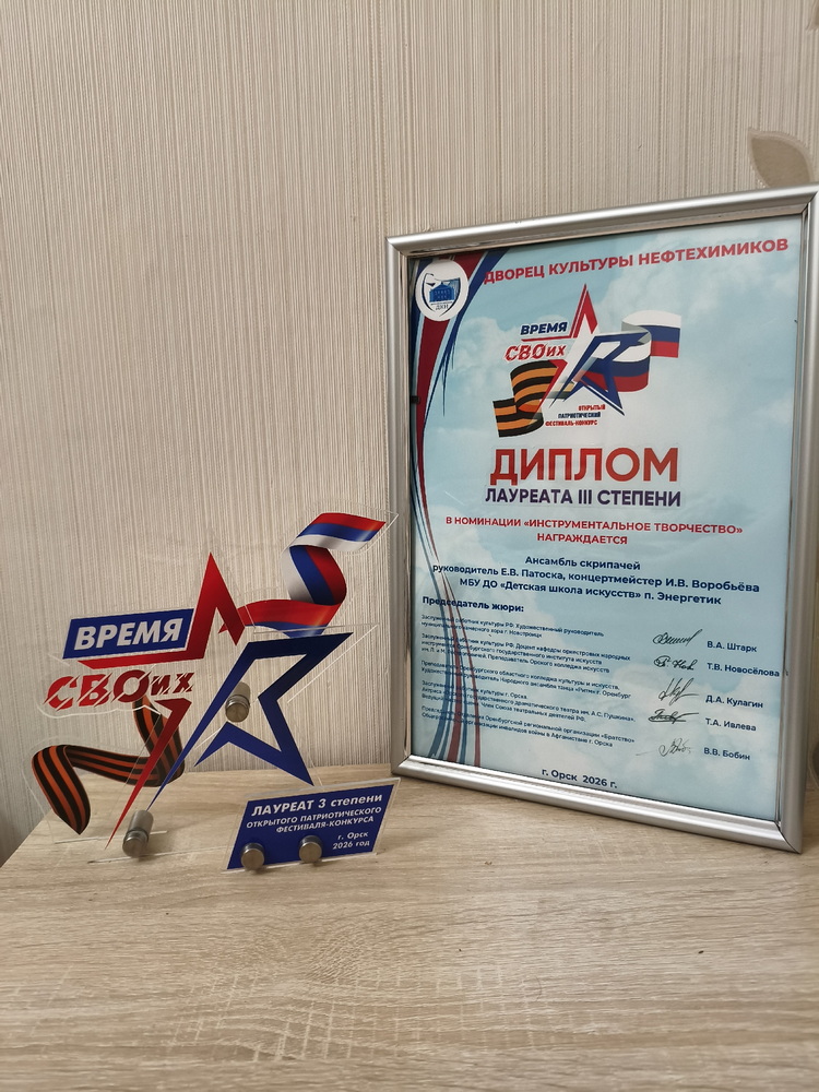 ОРСК. 7 февраля 2026 года ансамбль скрипачей Детской школы искусств посёлка Энергетик, под руководством Елены Патоска, принял участие в Открытом патриотическом фестивале-конкурсе «Время СВОих» и занял звание Лауреата III степени. Солистом выступил священник Димитрий Патоска, настоятель храма св. вмч. Георгия Победоносца п. Энергетика.
