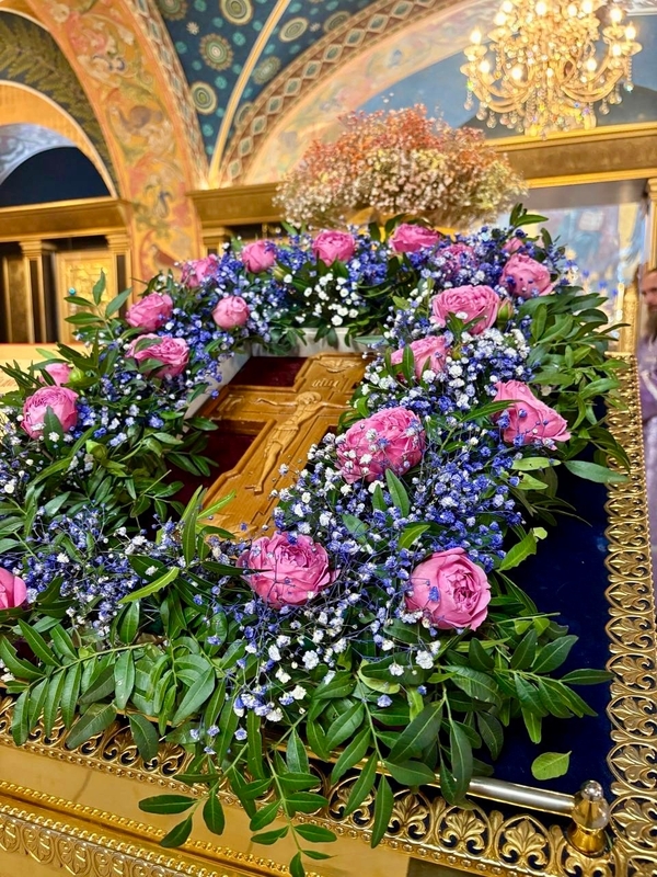 После пения великого славословия и Трисвятого Преосвященнейший Ириней совершил вынос Честного и Животворящего Креста на середину храма и вместе со священнослужителями совершил поклонение ему при пении тропаря Креста и песнопения "Кресту Твоему...". Правящий архиерей также совершил елеопомазание молящихся.