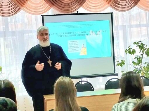 Открыл клуб «Поверь в себя» с приветственным словом протоиерей Вячеслав Кочкин. Батюшка пообщался с молодыми людьми, отметив: «В человеке должен быть стержень – вера в Бога». В ходе общения священник, как настоятель храма святого великомученика и целителя Пантелеимона г. Орска, пригласил будущих выпускников интернатных учреждений на богослужения, а также на занятия в воскресную школу, где ребята смогут познакомятся с основами православной веры и духовной жизни. Отец Вячеслав вкратце рассказал о жизни прихода, обратив особое внимание на работу епархиального гуманитарного центра «Милосердие», который ежемесячно оказывает помощь нуждающимся людям. Священник Орской епархии предложил юношам и девушкам поработать волонтёрами в гумцентре.