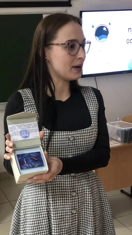Затем передала в руки ребятам и педагогам настоящее космическое питание и самый настоящий кусочек метеорита, поддержав который все присутствующие загадали желания.