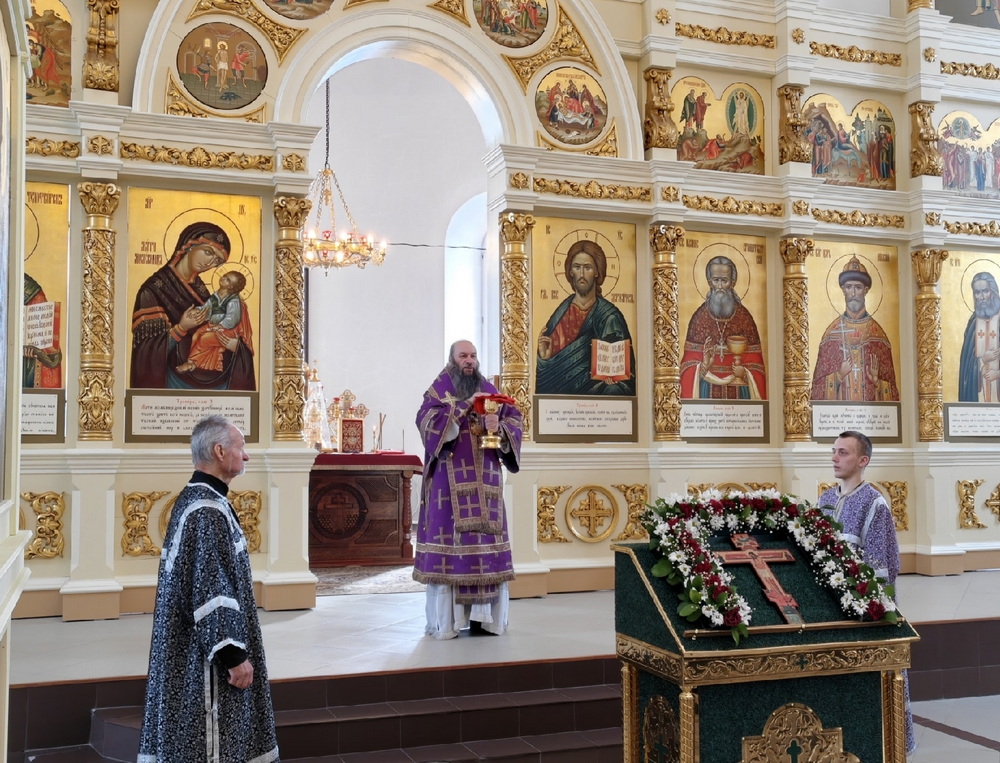 За Литургией Преждеосвященных Даров Его Преосвященству сослужили клирики собора священники Григорий Сычёв и Михаил Евграфов.