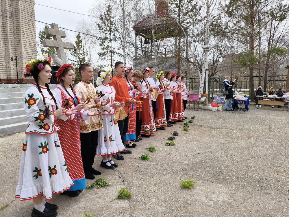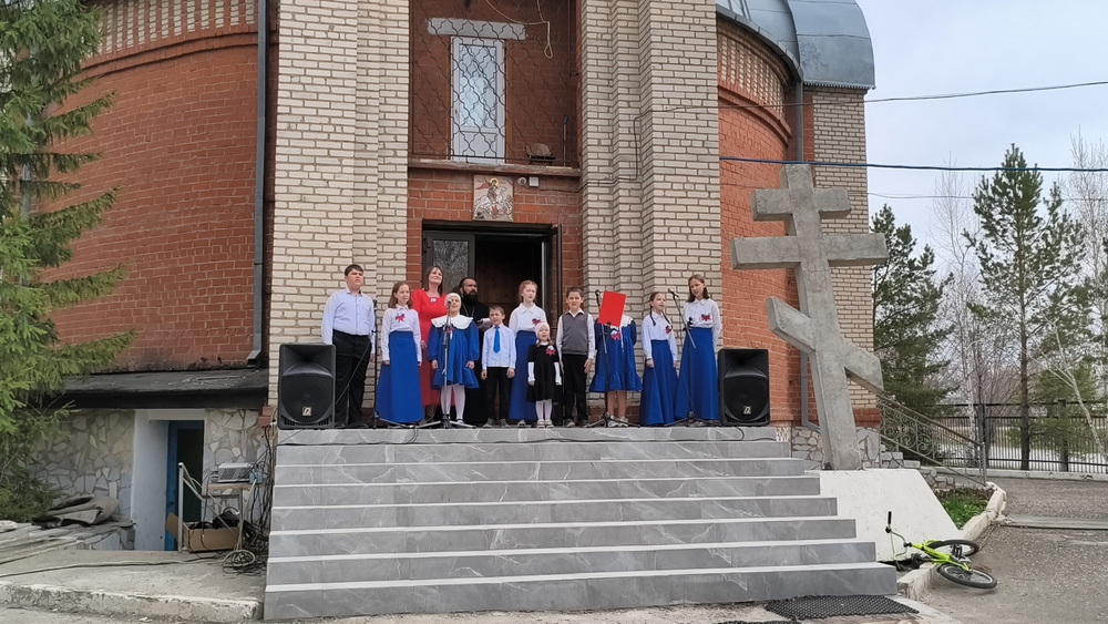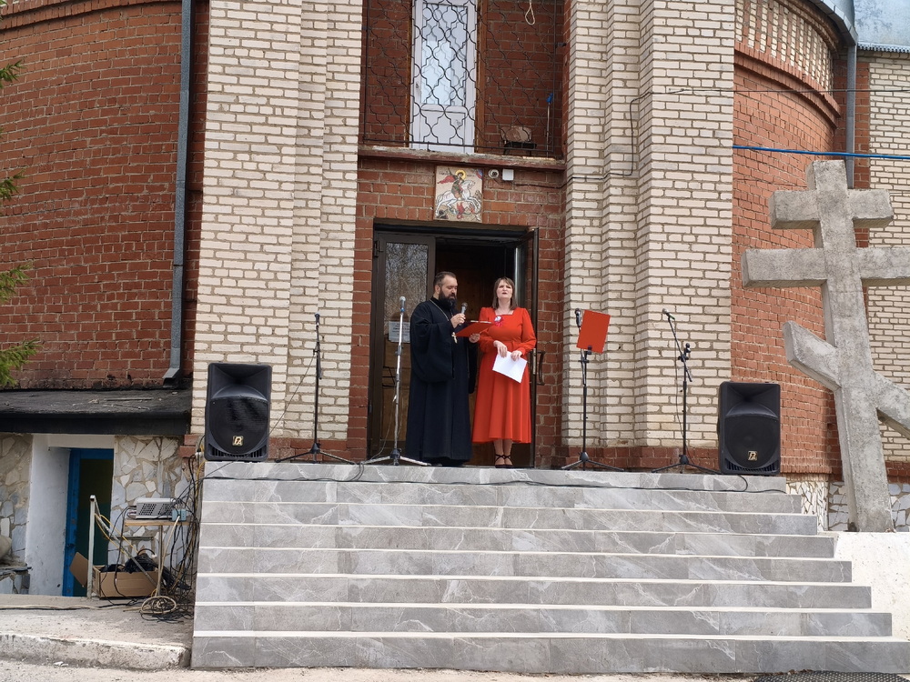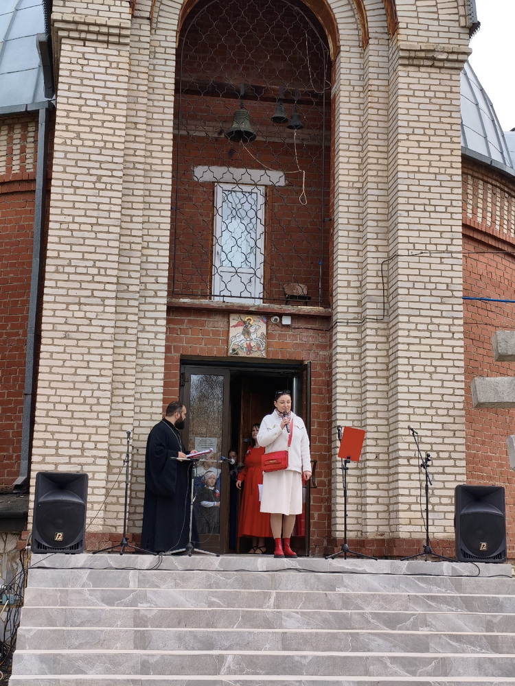 Праздник открылся проникновенным вступительным словом настоятеля — иерея Димитрия Патоска. Душевное звучание пасхального концерта подарили ученики Воскресной школы «Святой Георгий» (руководитель — матушка Патоска Е. В.). С радостным приветствием в честь Пасхи Христовой выступили также учащиеся Школы № 1 и краеведческого объединения «Патриот» в сопровождении советника по воспитанию Бибиковой И. А.