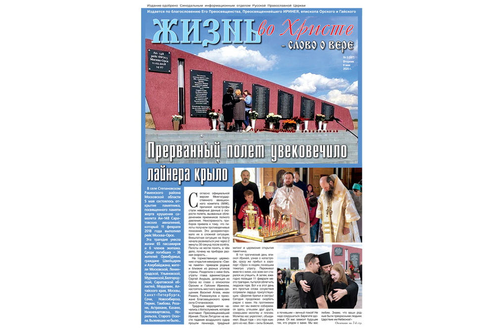 Центральный материал номера – «Прерванный полет увековечило лайнера крыло» – рассказывает об открытии в селе Степановском Раменского района Московской области памятника, посвященного памяти жертв крушения самолета Ан-148, который 11 февраля 2018 года выполнял рейс Москва-Орск. На торжественную церемонию открытия мемориала «Свеча памяти» приехала делегация из Орска во главе с епископом Иринеем.