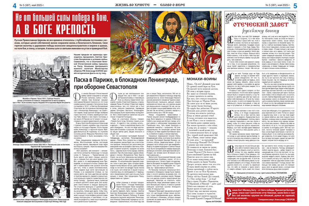 К празднованию юбилея Великой Победы опубликован ряд материалов: «80 лет Великой Победы: величие подвига, святость памяти», «Не от большей силы победа в бою, а в Боге крепость», «Пасха в Париже, в блокадном Ленинграде, при обороне Севастополя», «Отеческий завет русскому воину».