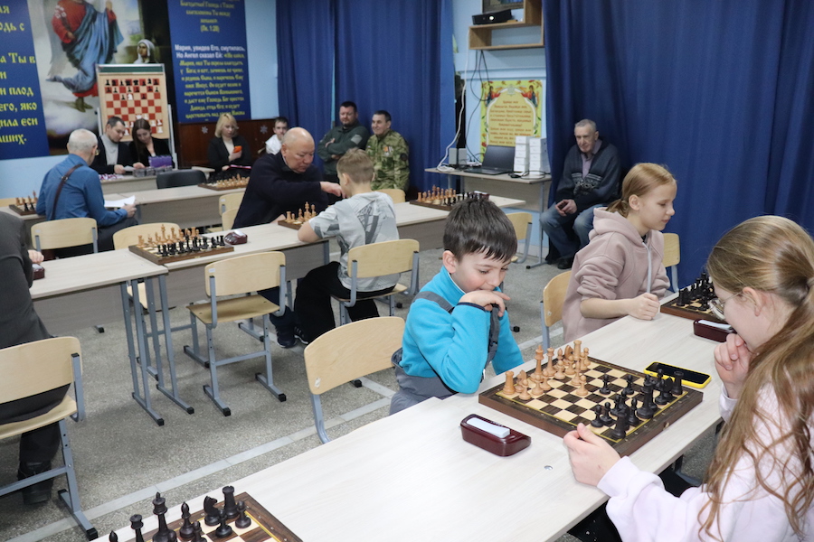 НОВОТРОИЦК. 25 февраля 2026 г. В соборе святых апостолов Петра и Павла состоялся патриотический шахматный турнир, в котором приняли участие дети участников СВО, воспитанники детской воскресной школы имени святого благоверного великого князя Александра Невского, ветераны спорта, почетные гости.