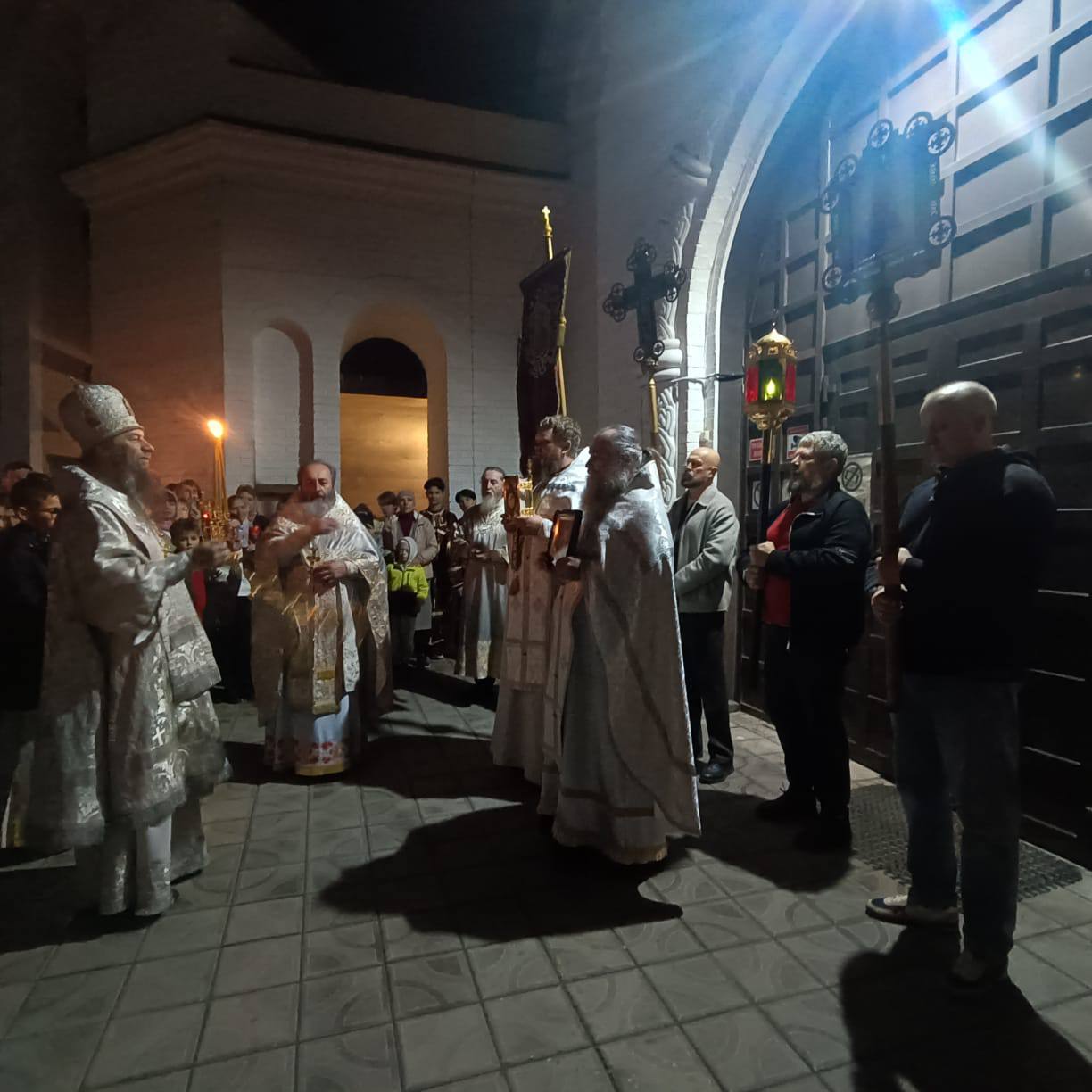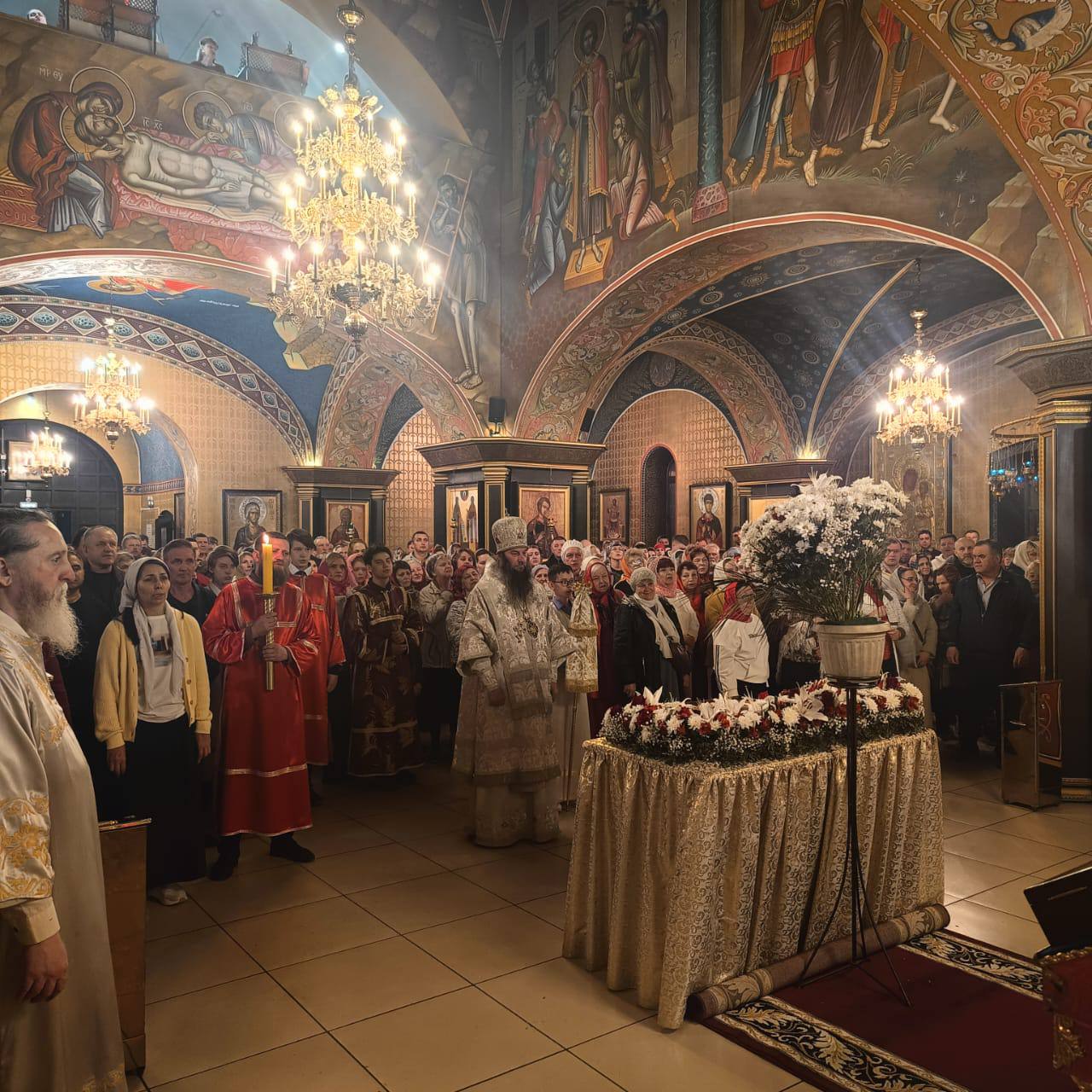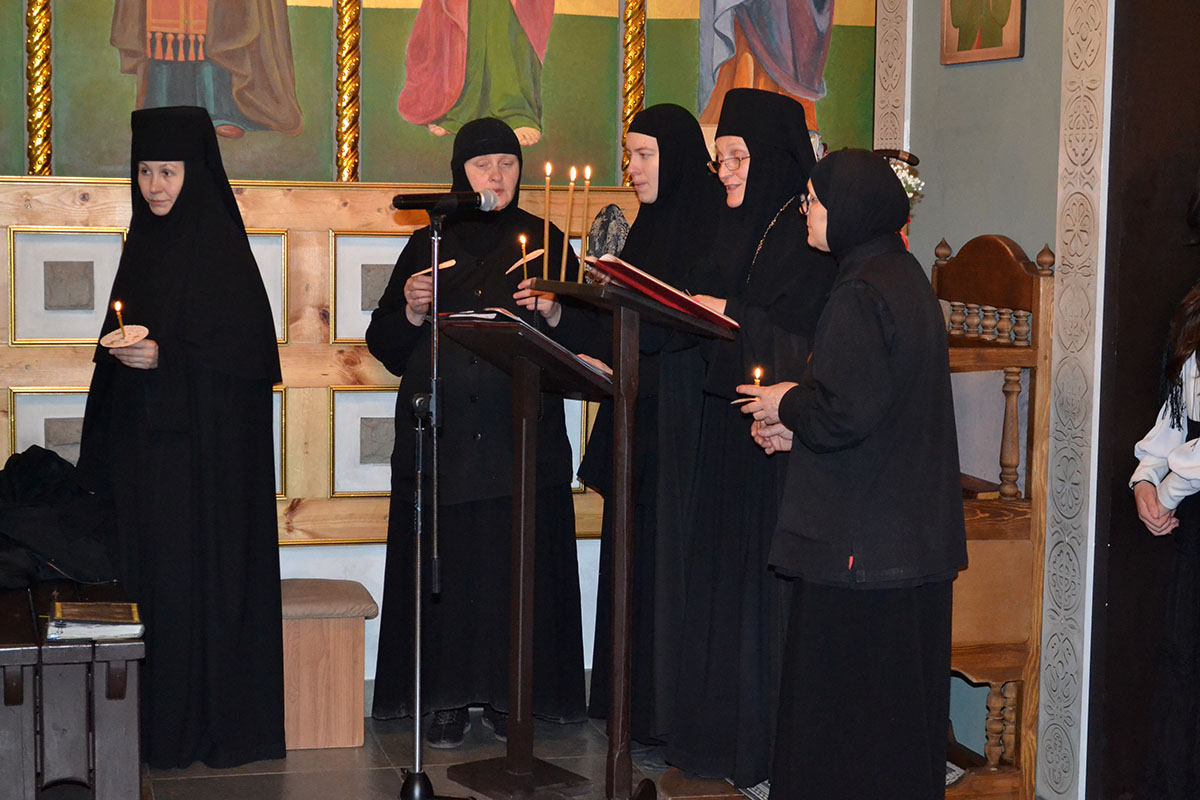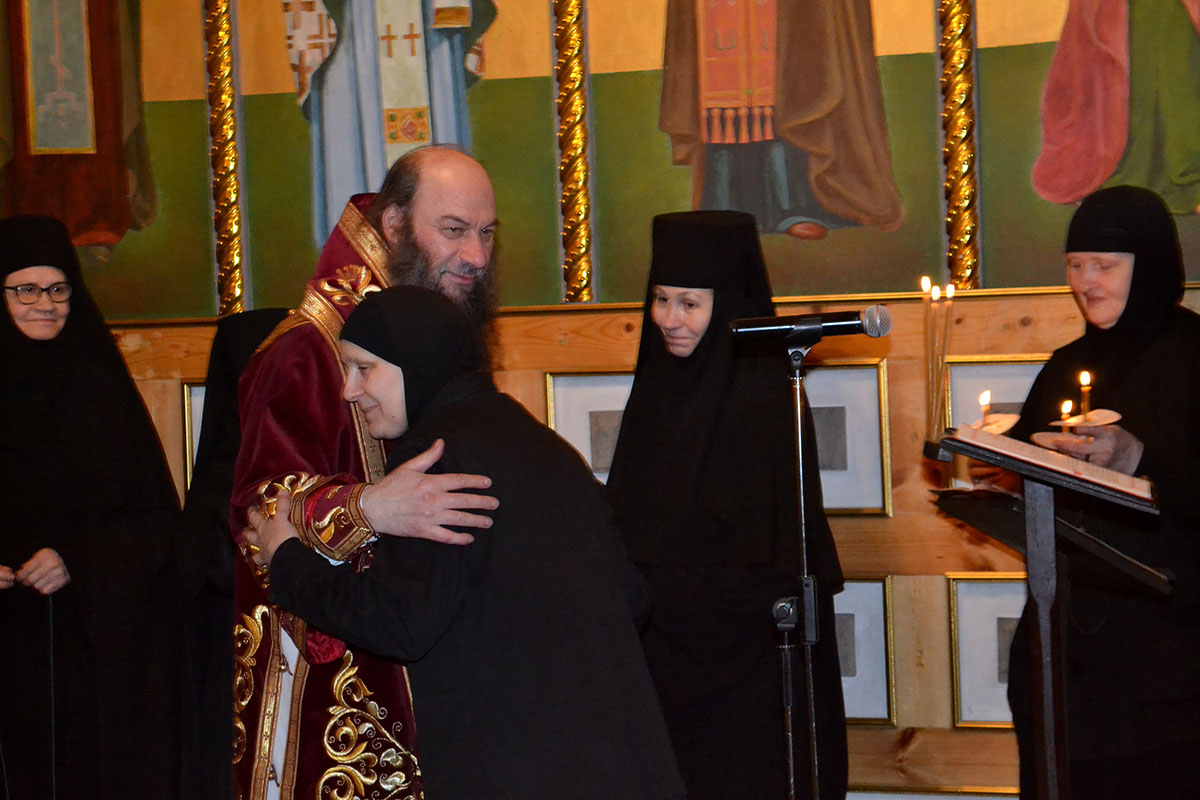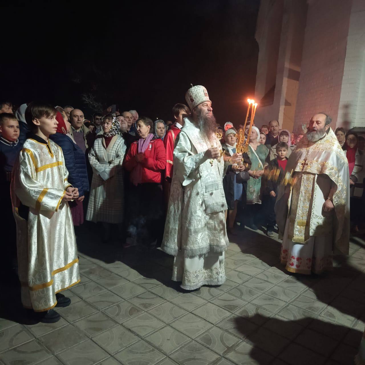 После пения пасхального канона Преосвященнейший Ириней в сопровождении архидиакона Викентия (Геницэ) отправился в Иверский женский монастырь, где был встречен духовенством, сестрами обители во главе с игуменией и прихожанами.