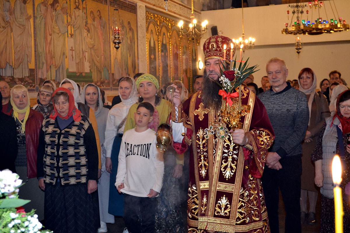 После пения пасхальных часов правящий архиерей возглавил служение Божественной литургии Иоанна Златоуста.