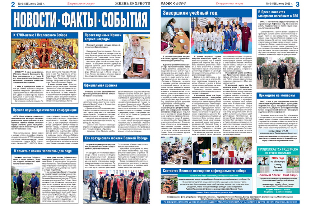 В информациях под рубрикой «Епархиальная жизнь» вы узнаете о наиболее важных событиях: о праздновании 1700-летия Первого Вселенского Собора и 80-летия Победы в Великой Отечественной войне; о закладке Сквера памяти орчан, погибших в зоне СВО; о завершении очередного учебного года в церковно-приходских воскресных школах, группах и студиях. Здесь же – указы и распоряжения правящего архиерея, объявления и анонсы.