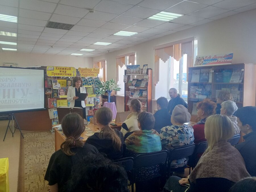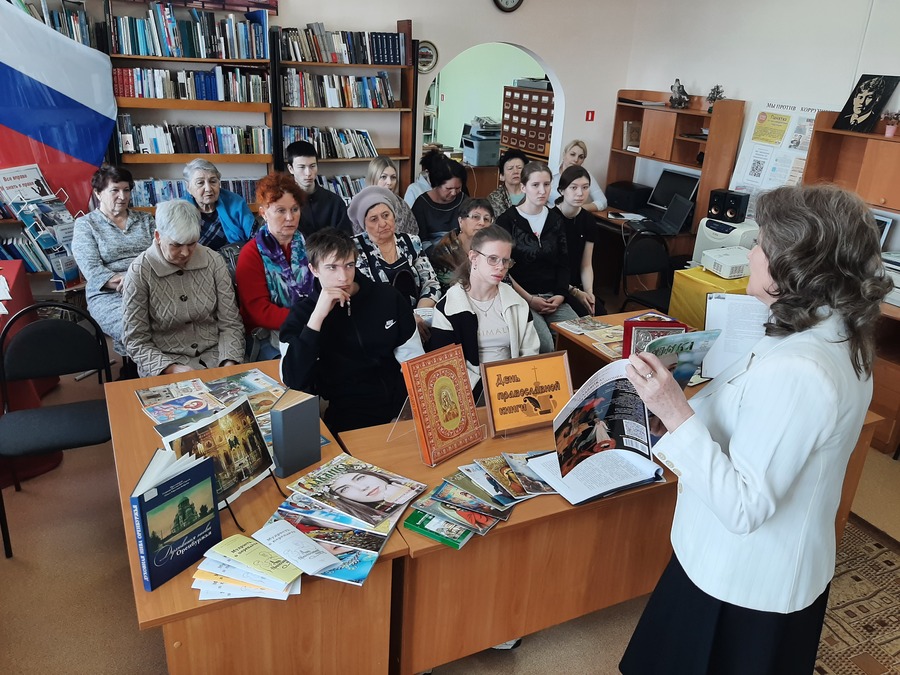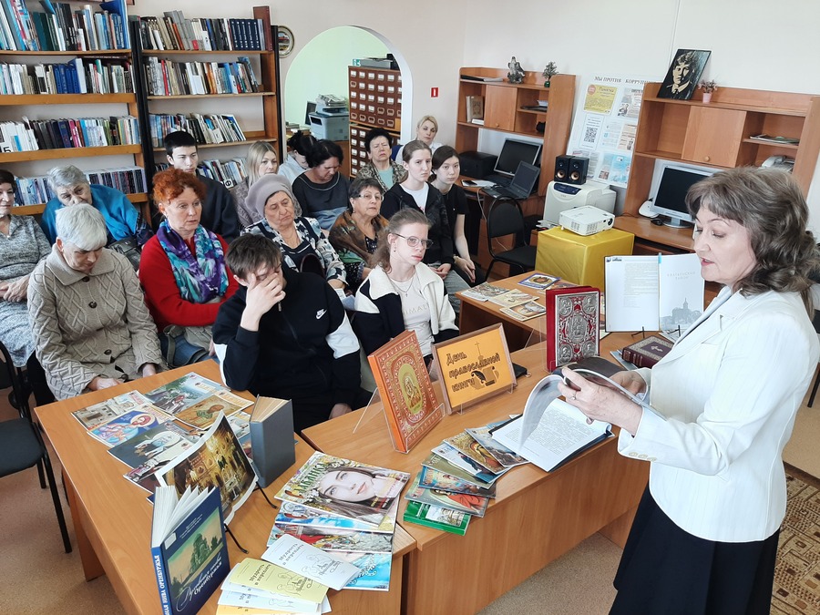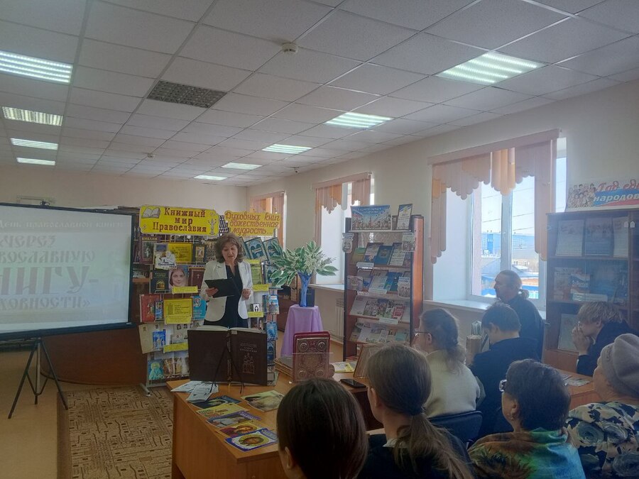 Вначале работник библиотеки Иванова Т.А. поведала слушателям историю первого печатного издания на Руси книги "Апостол" и установления дня православной книги в России 14 марта. Ее рассказ сопровождался фото и видео презентацией. Затем присутствующим была представлена выставка православной литературы библиотеки и рассказано о наличии православных книг, которые можно взять читателям домой.