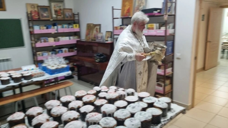 В это время в Епархиальном гуманитарном центре «Милосердие» протоиерей Вячеслав Кочкин освящал куличи, которые были испечены прихожанами для нуждающихся и малообеспеченных людей.
