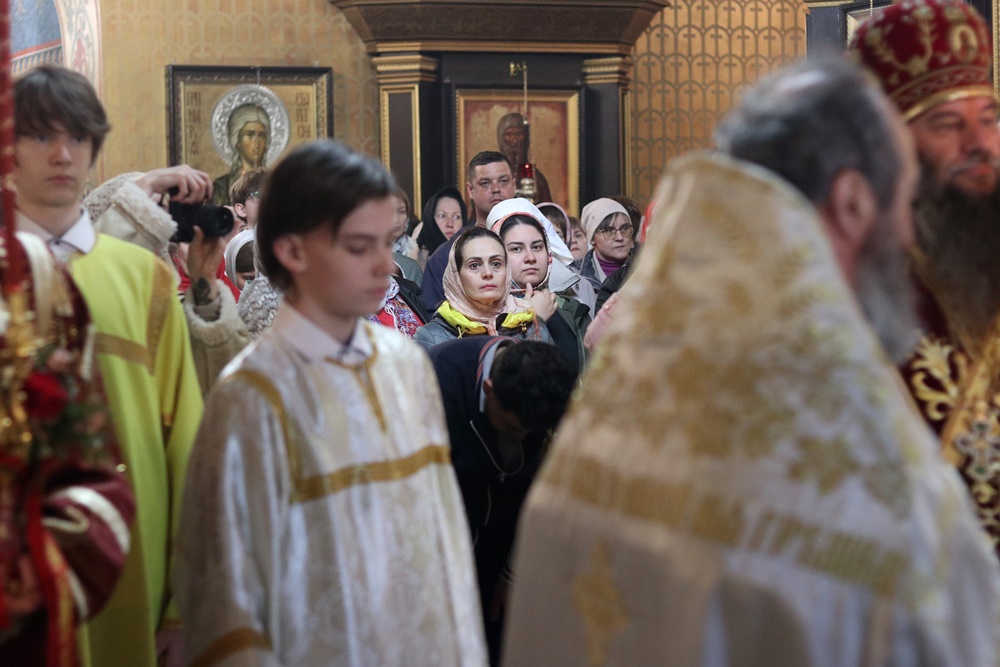 Незадолго до полуночи священнослужители совершили пасхальную полунощницу. При пении катавасии 9-й песни канона "Не рыдай Мене, Мати...", Святая Плащаница была унесена в алтарь через Царские Врата. Далее состоялся крестный ход вокруг храма, а ровно в 00 часов Преосвященнейший Ириней возгласил начало заутрени и поздравил всех первым радостным "Христос Воскресе!"