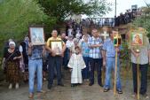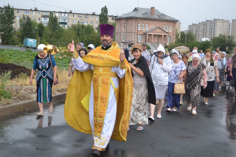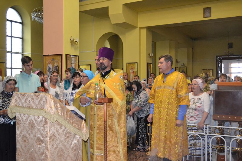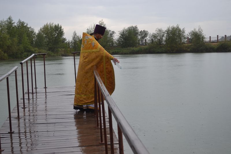 Богослужение совершили настоятель храма свв. апп. Петра и Павла протоиерей Сергий Кваша и клирик храма иерей Сергий Волков. Затем верующие, несмотря на непогоду, с иконами и хоругвями направились крестным ходом к храмовому озеру, где по традиции у водоема священник освятил озеро водой из реки Иордан, которую привезли паломники.