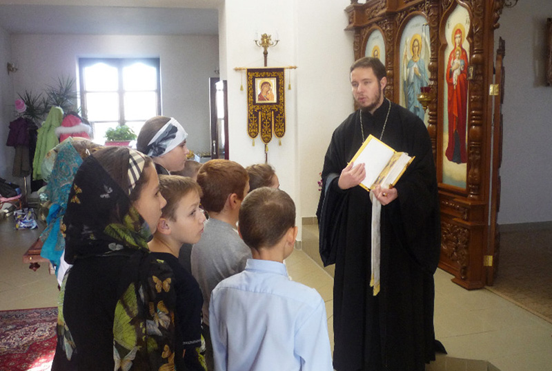 К сожалению, многие детки здесь были впервые. Гостей встретил настоятель храма иерей Евгений Селивёрстов. Батюшка рассказал о совершенстве форм православного храма, о его устройстве. О том, что храм – это своеобразный гимн красоте и премудрости сотворенного Богом мира. О том, что он выражен в единстве трёх областей: земной, небесной и Божественной. Отсюда наиболее трёхчастное деление храма: притвор, собственно храм и алтарь. Особенно школьникам интересно было узнать об алтаре, самом таинственном и закрытом месте храма. Было радостно видеть неподдельный интерес детей к духовному миру. Школьники проявили желание подняться по лестнице на клирос, а также поставить свечи за упокой бабушек и дедушек и за здравие родителей.