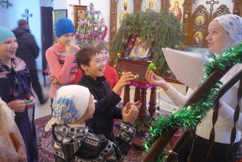 После Божественной литургии, сильно волнуясь, дети начали выступление. В храме царила тишина. Бабушки, дедушки и родители ловили каждое слово, исходящее из уст выступающих. И когда ребята закончили представление и спели завершающую песенку «Маленькой ёлочке…», раздалось восторженное рукоплескание со словами: «Молодцы, ребята!» Ещё одной радостью было то, что на нашем утреннике присутствовали гости-детишки, которые пришли посмотреть на праздник. Они, в свою очередь, тоже приготовили нам стихи и загадки. Было даже семейное выступление, когда мама с дочкой исполнили рождественскую песню. И, конечно же, никто не остался без поощрительных наград. Но это была только часть утренника, дальше детей ждали увлекательные игры. Радости и восторгу не было предела! А пока ребятишки забавлялись, родители суетились, накрывая праздничный стол.