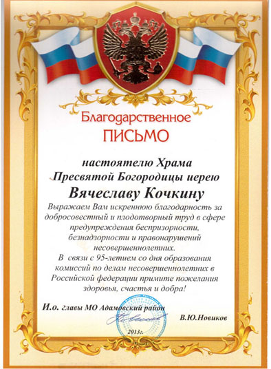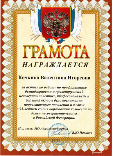 Заместитель главы района по социальным вопросам, председатель комиссии по делам несовершеннолетних и защите их прав Ольга Елохина отметила важность этой структуры. А исполняющий обязанности главы администрации Адамовского района Вячеслав Новиков наградил активных членов комиссии. В частности, благодарственным письмом отмечена работа благочинного Адамовского округа, настоятеля храма Покрова Пресвятой Богородицы п. Адамовки иерея Вячеслава Кочкина в сфере предупреждения беспризорности, безнадзорности и правонарушений несовершеннолетних. Почётной грамотой награждена также матушка Валентина Кочкина, врач-нарколог Адамовской ЦРБ за добросовестный и плодотворный труд в той же сфере. Валентине Игоревне пришлось принимать поздравления и за отца Вячеслава, поскольку батюшка в это время совершал службы на территории района.