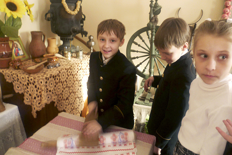 Ребята также посетили выставочный зал, где представлены предметы крестьянского быта прошлых веков. Учащиеся пробовали ставить в печь чугунок, рубить овощи, пользоваться веретеном.