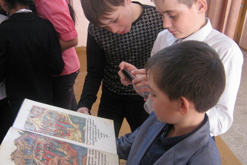 В марте 2013 года исполняется 450 лет, как Иван Федоров начал подготовку к изданию первой печатной книги на славянском языке «Апостол». Ребята также узнали об «Острожской Библии» и первом печатном учебнике на славянском языке «Азбука». Это издание вызвало особый интерес, потому что школьники смогли не только увидеть его на слайдах, но и подержать в руках фотокопию книги. Единственный оригинал издания 1574 года хранится в библиотеке Гарвардского университета (США). Заинтересовало школьников и факсимильное издание книги «Повесть о Куликовой битве», замечательно украшенное многочисленными гравюрами.