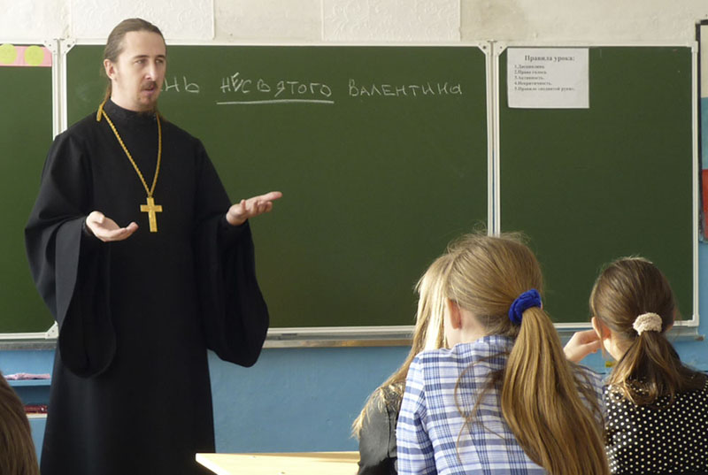КВАРКЕНО. 12 февраля 2013 г. Настоятель храма Казанской иконы Божией Матери иерей Владимир Бабак провёл в общеобразовательной школе урок для учеников восьмого класса на тему: "День несвятого Валентина".