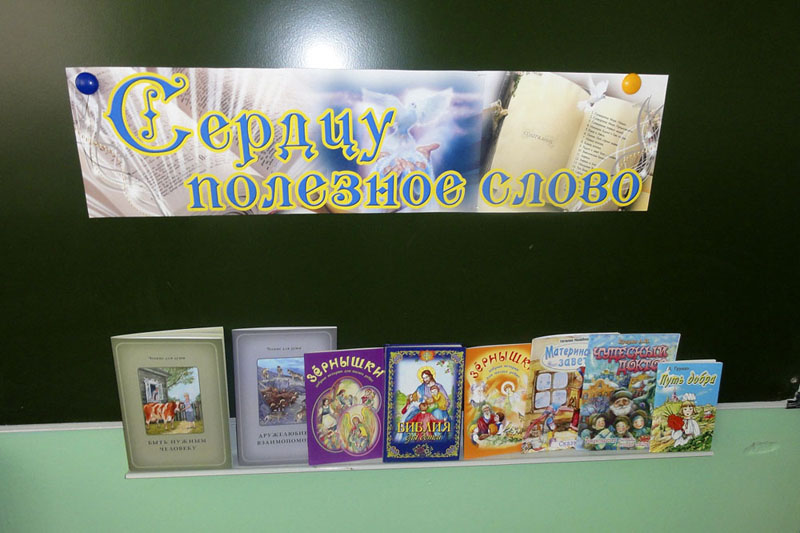 Вниманию детей была представлена выставка детской православной литературы «Сердцу полезное слово». Экспонаты для выставки подготовила преподаватель воскресной школы храма святителя Николая чудотворца г. Медногорска (микрорайон «Южный») Г.Бобрусова, представив вниманию публики книги из фондов приходской библиотеки.
