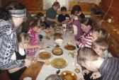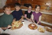 Утро началось с молитвы на Божественной литургии, после которой, исповедовавшись и причастившись Святых Христовых Тайн, все отправились в трапезную. Здесь по сложившейся традиции выпекали блины, перенимая технику и опыт у преподавателей домоводства. Тонкие, воздушные, румяные «солнышки» заполняли столы трапезной! Как только была закончена выпечка, все с усердием и старанием принялись украшать блины фруктами, сгущенным молоком, орехами и другими начинками. Затем началось праздничное чаепитие, за которым все созданные детскими ручками блинные тортики, рулетики были с аппетитом съедены.