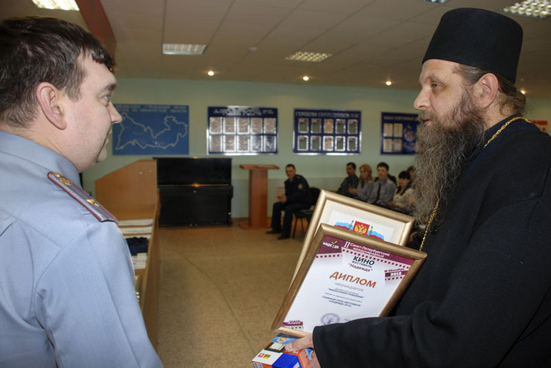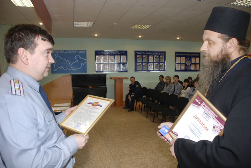 НОВОТРОИЦК. 22 МАРТА 2013 г. Начальник ФКУИК-5 УФСИН РФ по Оренбургской области майор внутренней службы А. Васильев поздравил протоиерея Сергия Баранова, секретаря Орской епархии, настоятеля храма св. вмч. Георгия Победоносца г. Орска с высокой наградой. Его фильм «Философия покаяния» завоевал Гран-при на втором международном кинофестивале «Надежда», который состоялся в Санкт-Петербурге.