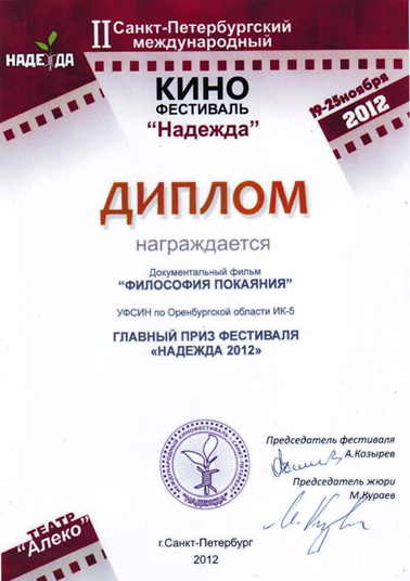 «Надежда» – единственный в мире правозащитный фестиваль, где демонстрируются фильмы, созданные осужденными в местах лишения свободы. «Философия покаяния» признана лучшей среди более чем 150 фильмов из России и многих зарубежных стран. Отец Сергий Баранов – автор сценария и режиссер фильма; оператор – орчанин Юрий Золотарев; монтаж Андрея Акимова (ныне покойного).