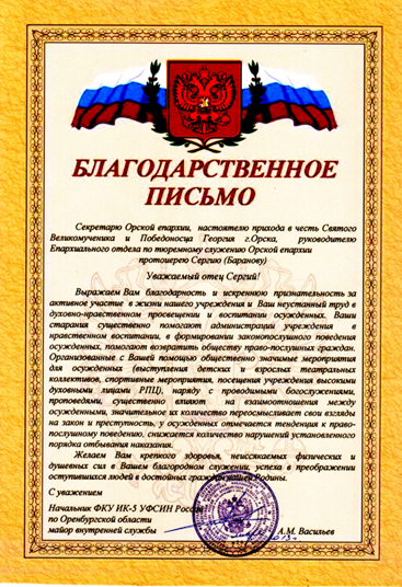 «Выражаем Вам благодарность и искреннюю признательность за активное участие в жизни нашего учреждения и Ваш неустанный труд в духовно-нравственном просвещении и воспитании осужденных,– сказал А. Васильев. – Ваши старания существенно помогают администрации колонии возвратить обществу правопослушных граждан. С Вашей помощью организуются общественно значимые мероприятия для осужденных: выступления детских и взрослых театральных коллективов, спортивные мероприятия, посещение колонии духовенством, в том числе и архипастырем Орской епархии – епископом Орским и Гайским Иринеем. Проводимые здесь богослужения и проповеди существенно влияют на взаимоотношения между осужденными, значительное их количество переосмысливает свои взгляды на закон и преступность. Отмечается тенденция к право¬послушному поведению заключенных, снижается количество нарушений установленного порядка отбывания наказания…»