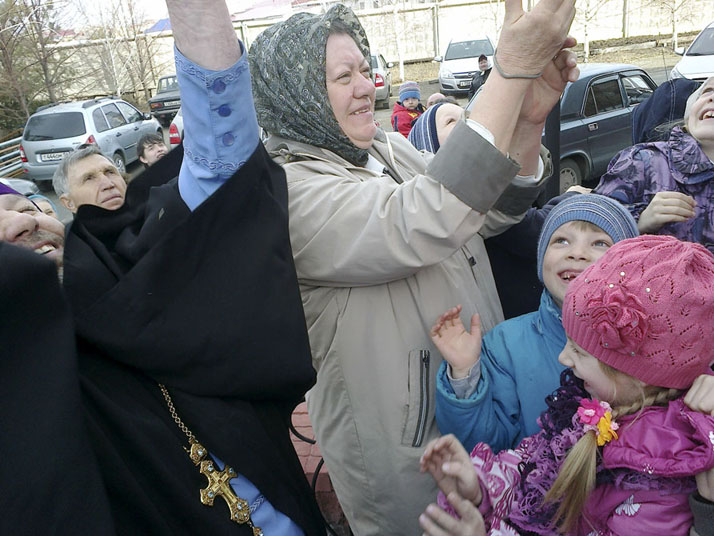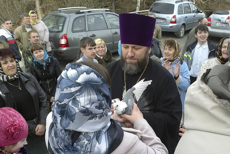 После службы и молебна настало долгожданное событие для всех ребятишек. Они усердно молились за богослужением и молебном, а теперь, как награда за послушание, – выпустят в небо голубей. Восторгу детей нет предела. Каждому хочется дотронуться до голубя, взять его в руки и выпустить в небесную синеву. Когда голуби взлетели, все дружно вскричали: «Ура!!!» Взрослые радовались не меньше детей и с удовольствием наблюдали за полетом освобожденных птиц.