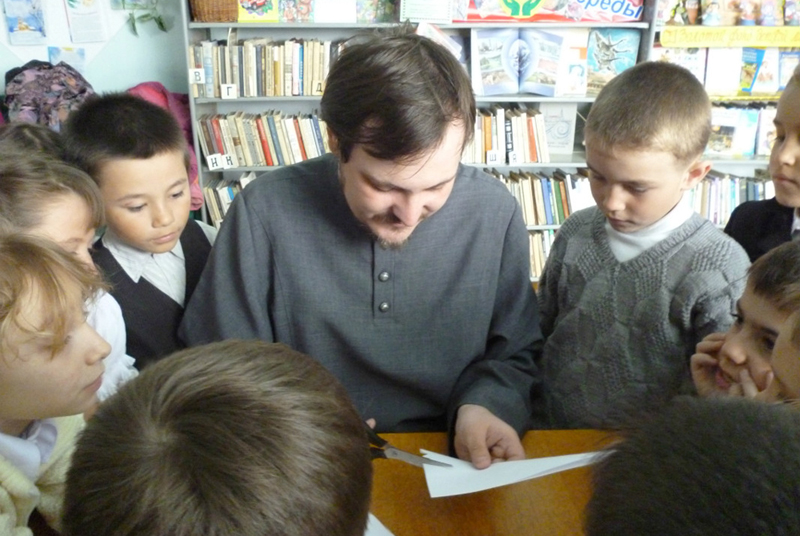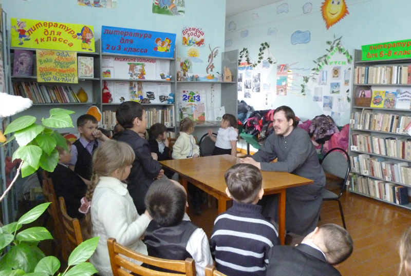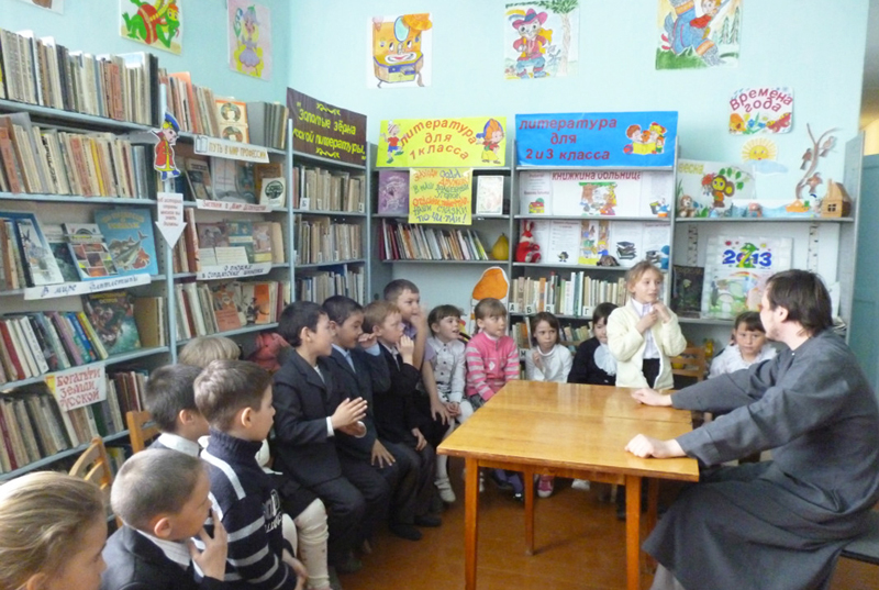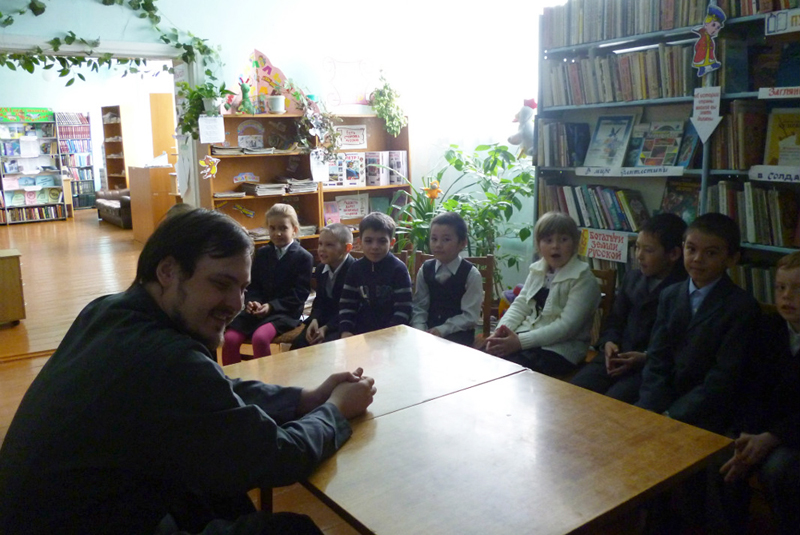 КУМАК. 11 апреля 2013 г. В сельской библиотеке прошла интересная встреча учащихся первого класса и настоятеля храма Покрова Пресвятой Богородицы с. Кумака иеромонаха Феодора (Липкина).