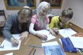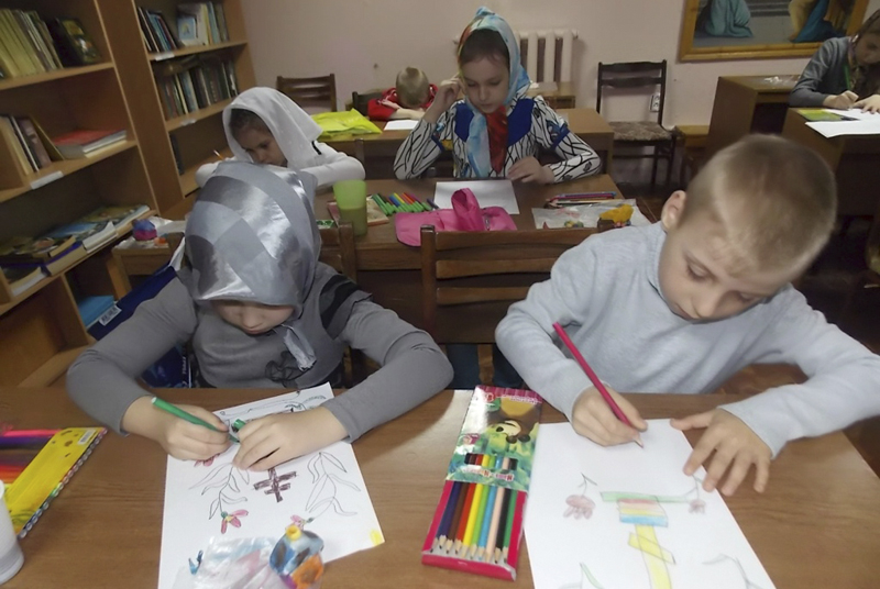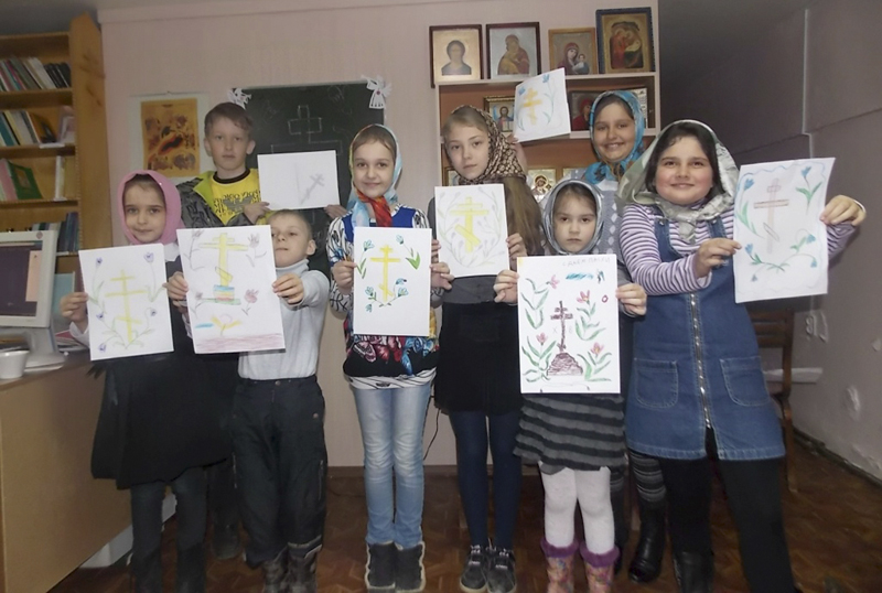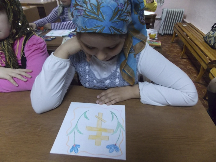 Центральный этап урока – рисование – потребовал от учителя постоянного внимания и движения по классу. Изображение креста должно рождать у учеников только положительные эмоции, они должны верить, что добрый наставник поможет сразу, пока еще не поздно, укажет на ошибки и ободрит. Во время занятия в классе звучали великопостные песнопения и духовные детские песни. И вот рисунки готовы, а далее – очень важное завершение урока: добровольная выставка детских творений. Примечательно, что каждый ребенок сам решал: считает ли он свой рисунок достойным заключительной выставки на уроке, фотографированию для настоятеля храма игумена Онисима.