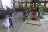 14 апреля настоятель храма иерей Сергий Кваша по окончании Божественной литургии пригласил всех желающих потрудиться во славу Божию. Откликнувшиеся на предложение в течение понедельника и вторника чистили и мыли, приводили в порядок Дом Божий. Каждый внес посильное участие в общем деле благоустройства и благоукрашения любимого храма, кто-то очищал газоны граблями и сажал цветы на территории, другие белили бордюры. В храме мыли окна, чистили и мыли предметы интерьера храма и алтарь.